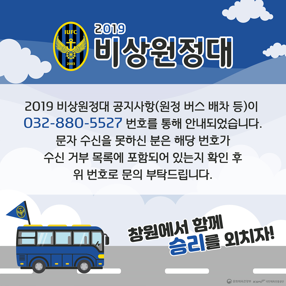 2019 비상원정대 공지사항(원정 버스 배차 등)이 032-880-5527 번호를 통해 안내되었습니다.