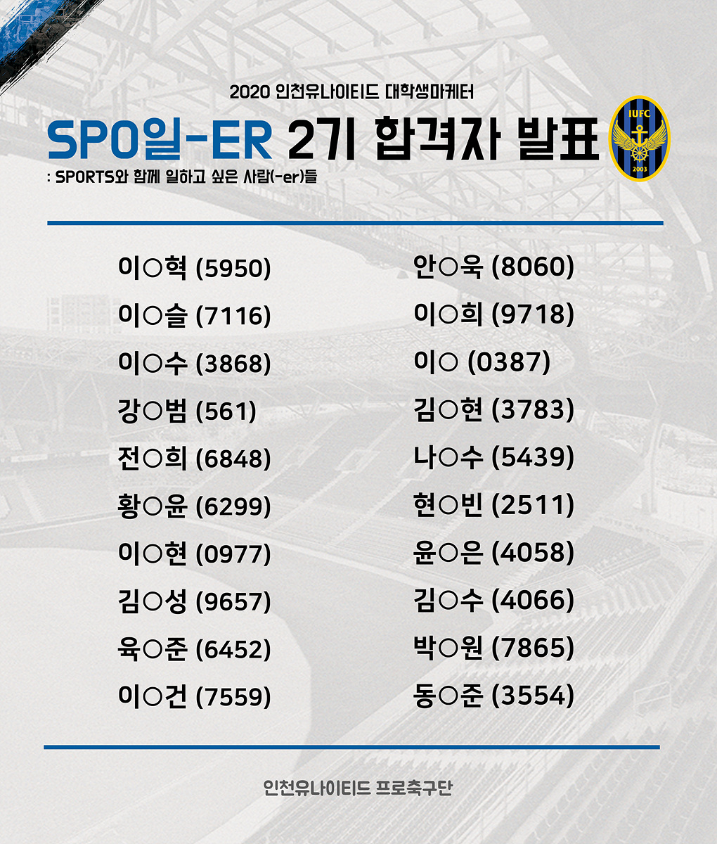 2020시즌 인천유나이티드를 위해 노력할 대학생 마케터 '스포일러' 2기 최종합격자 명단을 발표합니다.