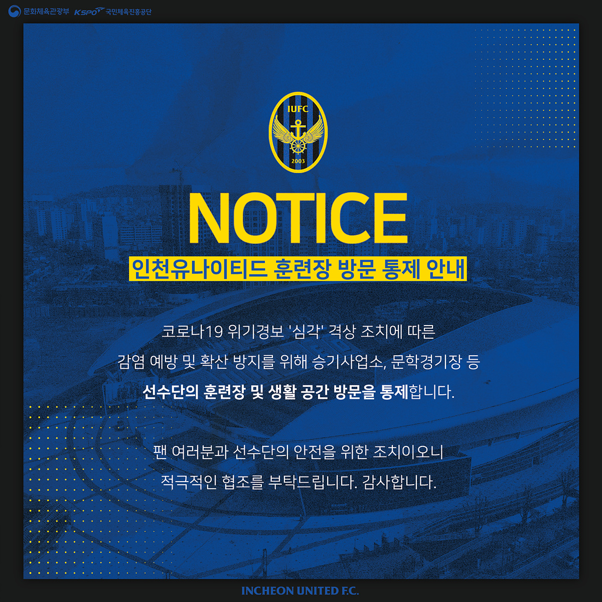 팬 여러분과 선수단 모두의 안전을 위한 조치이오니 적극적인 협조를 부탁드립니다. 감사합니다.INCHEON UNITEDMEDIA FEEDS