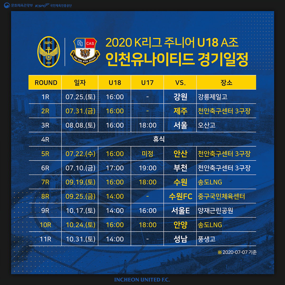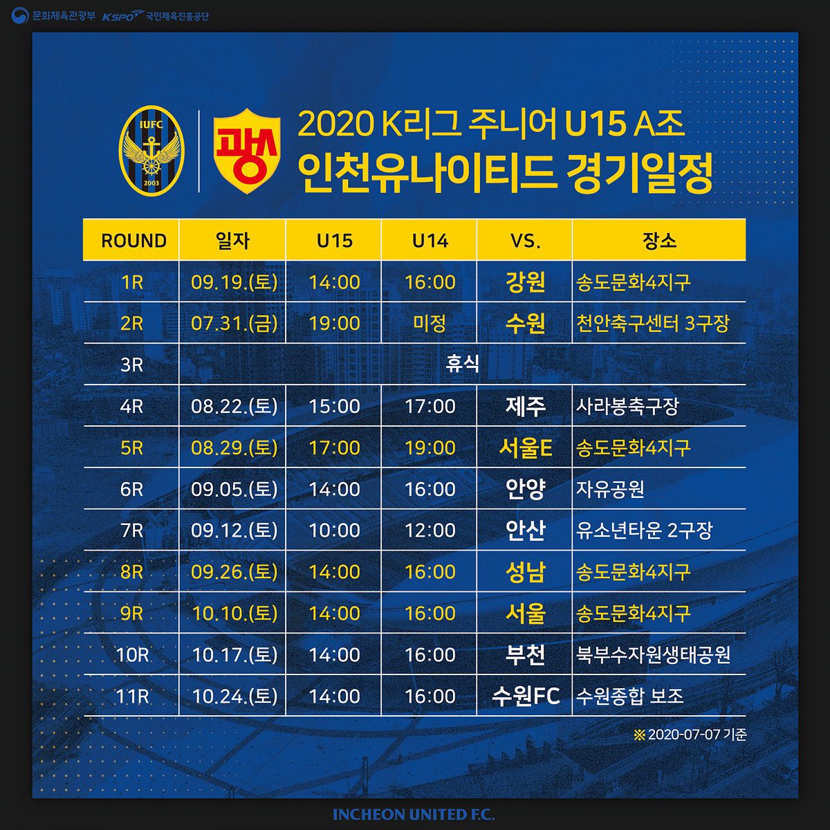 *유스 경기 특성상 경기 일시 및 장소 등의 변화가 잦을 수 있습니다. 구단의 별도 공지를 꼭 참고해주시기 바랍니다.
