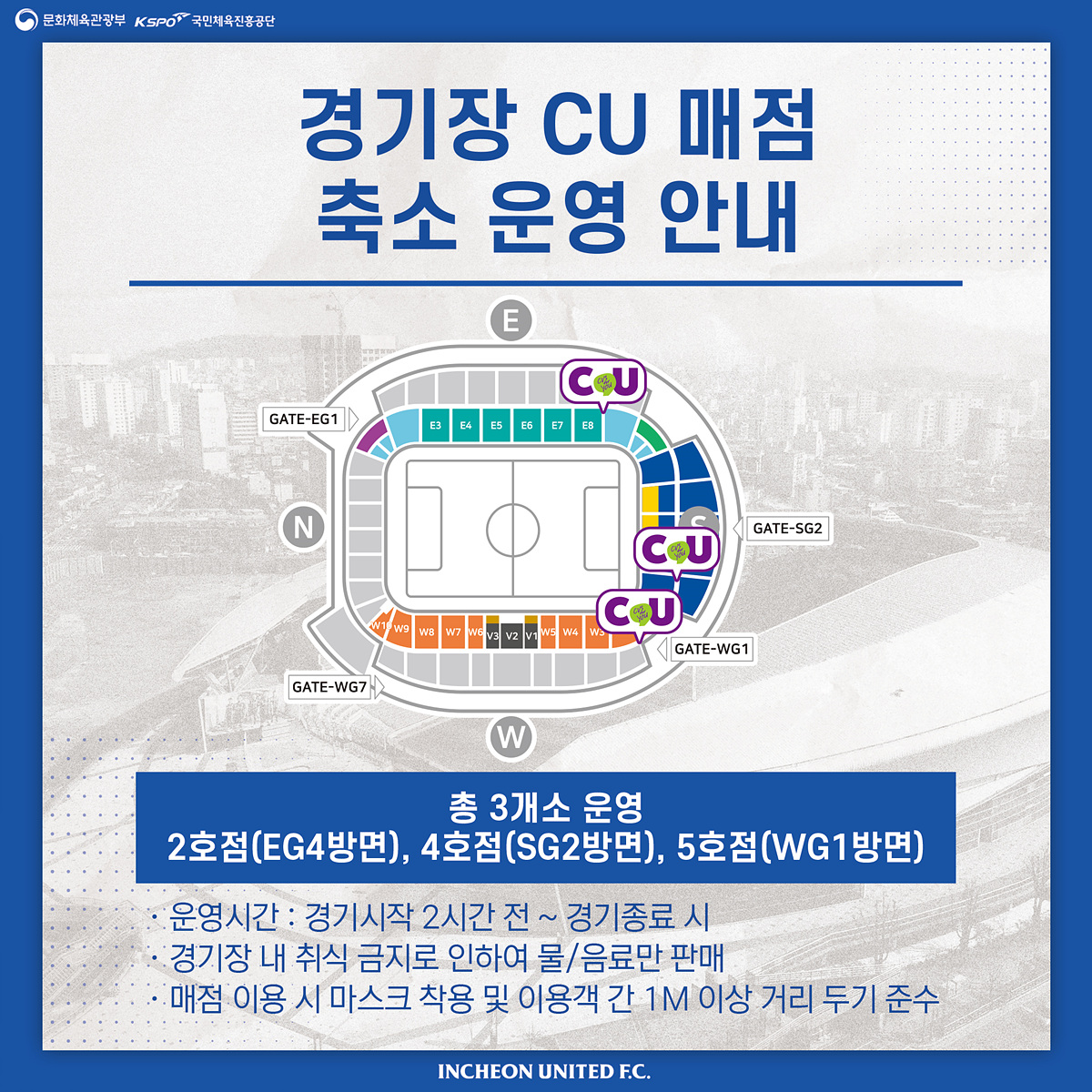K리그 연맹 지침상 경기장 내 음식물/주류 반입 금지 및 취식이 금지되어 있어 경기장 내 CU 편의점을 축소 운영합니다. 자세한 사항은 이미지를 참고해주세요.