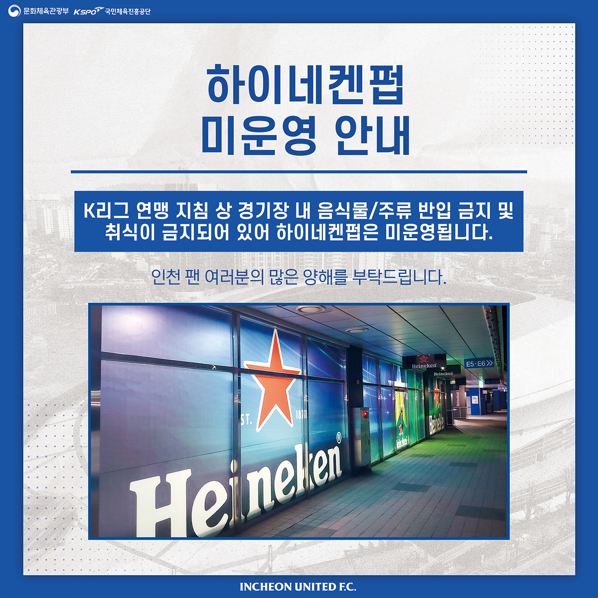 K리그 연맹 지침상 경기장 내 음식물/주류 반입 금지 및 취식이 금지되어 있어 하이네켄펍은 운영되지 않습니다. 인천 팬 여러분의 많은 양해를 부탁드립니다.