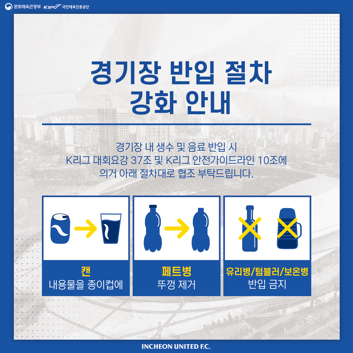 K리그 대회요강 37조 및 안전가이드 라인 10조와 13조에 따라 우리 구단은 홈경기 당일 경기장 물품 반입 절차 및 매점 판매 물품에 대한 관리 감독을 철저하게 진행하고 있습니다.