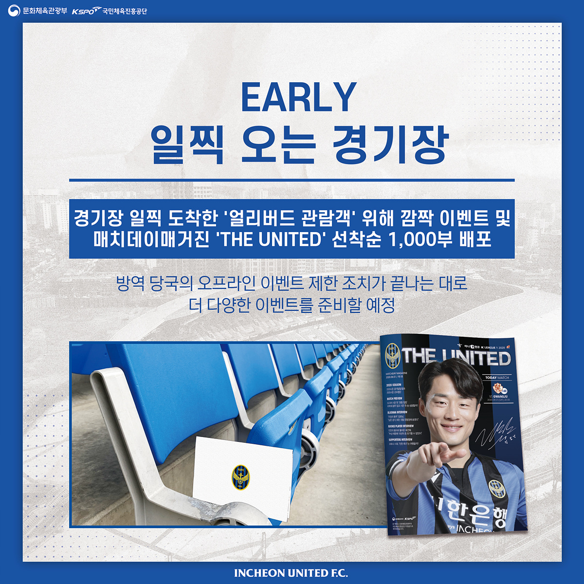 경기에 일찍 도착한 ‘얼리버드 관람객’을 위해 깜짝 이벤트를 준비했습니다. 그리고 일찍 오는 팬 여러분께 홈경기 현장에서만 받을 수 있는 특별한 인천유나이티드 매치데이매거진 ‘THE UNITED’를 선착순 1,000부 배포합니다. 팬 여러분 모두 경기장에 일찍 도착하셔서 혼잡도 피하고, 이벤트에도 참여하고, 매치데이 매거진도 받아가시길 바랍니다.