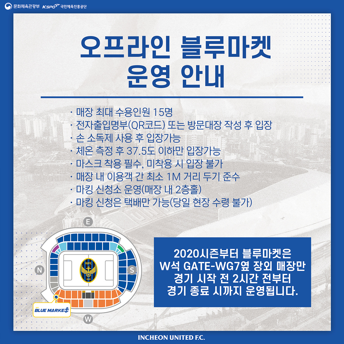이번 광주전 첫 유관중 홈경기 당일 오프라인 블루마켓 매장을 정상 운영합니다. 2020시즌부터 블루마켓은 W석 GATE-WG7옆 장외 매장만 경기 시작 전 2시간 전부터 경기 종료 시까지 운영됩니다. 이미지상 안내지침을 준수하여 안전한 쇼핑을 즐기시길 바랍니다.