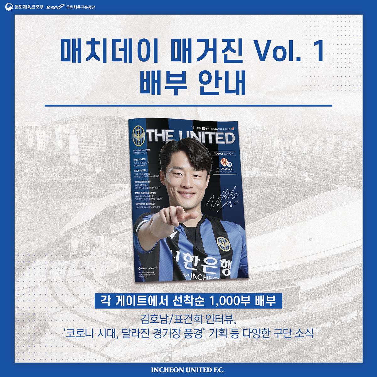 이번 광주전 첫 유관중 홈경기에 인천유나이티드 매치데이매거진 ‘THE UNITED’ Vol.1가 배포됩니다. 이번 경기 매거진에는 ‘인천의 아들’ 주장 김호남 인터뷰, ‘80대 1, 기적의 공개테스트 합격자’ 신인 표건희 인터뷰, 코로나 시대에 달라진 경기장 풍경 기획기사 등 다양한 구단 소식을 담았습니다. 광주전 홈경기 당일 각 입장 게이트에서 선착순 1,000부 배부될 예정이오니 인천 팬 여러분의 많은 관심과 구독을 부탁드립니다.