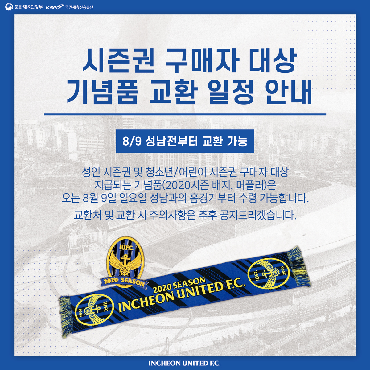 성인 시즌권 및 청소년/어린이 시즌권 구매자 대상 지급되는 기념품(2020시즌 배지, 머플러)는 오는 8월 9일 일요일 성남과의 홈경기부터 수령 가능합니다. 교환처 및 교환 시 주의사항은 추후 공지하겠습니다.