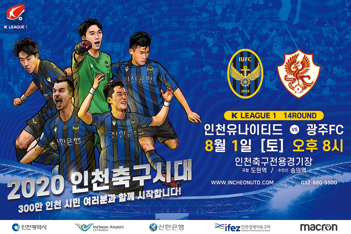 2020시즌 첫 유관중 홈경기 "Football without fans is nothing”, 인천 팬은 우리의 존재 이유입니다.8/1(토) 저녁 8시. 인천유나이티드가 광주FC를 상대로 2020시즌 K리그 1 14라운드를 치릅니다. 팬 여러분! 긴 코로나19 무관중 경기를 뒤로하고 오랜만에 우리의 홈구장 인천축구전용경기장에 찾아오시어 인천의 승리를 외쳐주세요. 우리 모두 목소리를 모아야 할 때입니다. WELCOME BACK HOME!