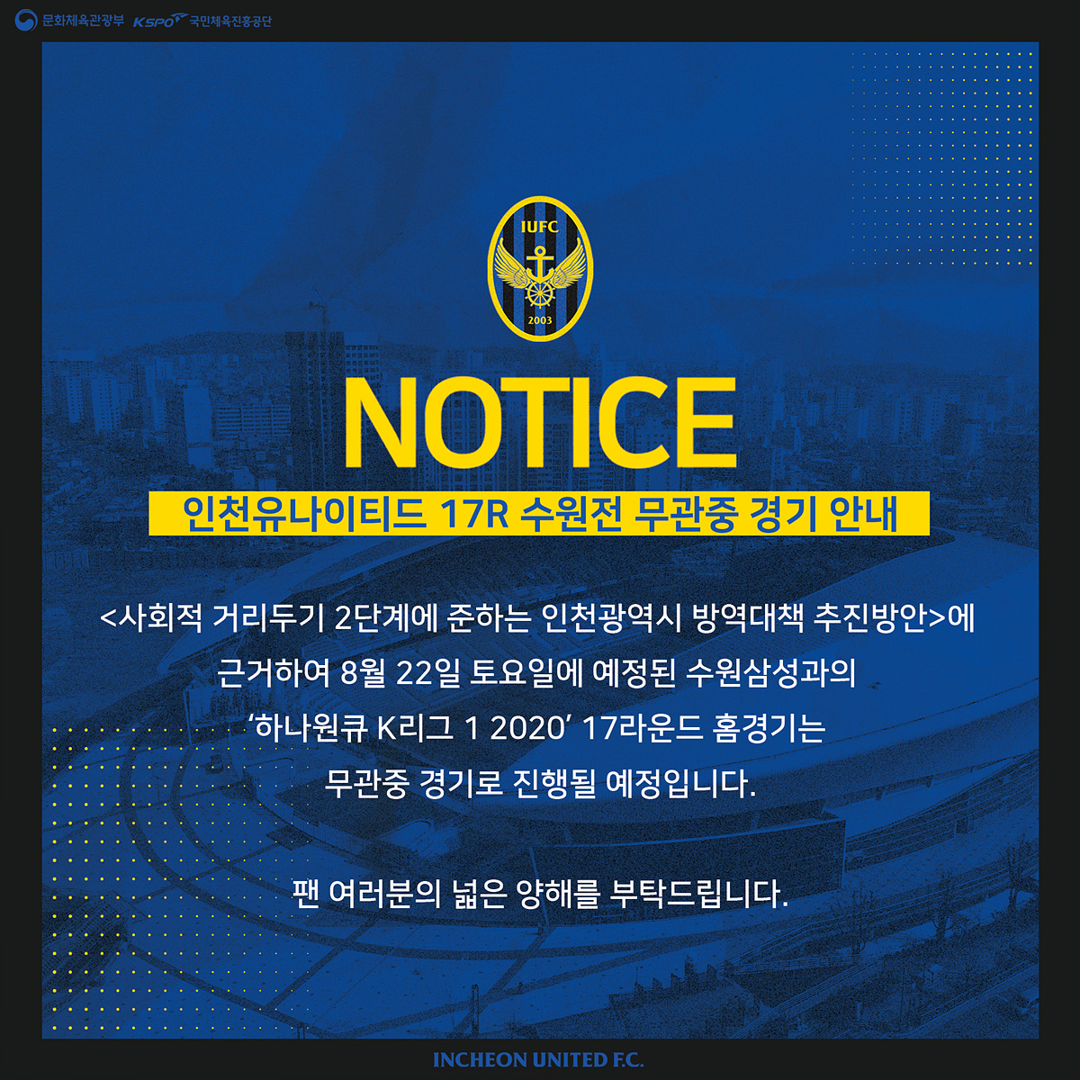 팬 여러분의 넓은 양해를 부탁드립니다.INCHEON UNITEDMEDIA FEEDS
