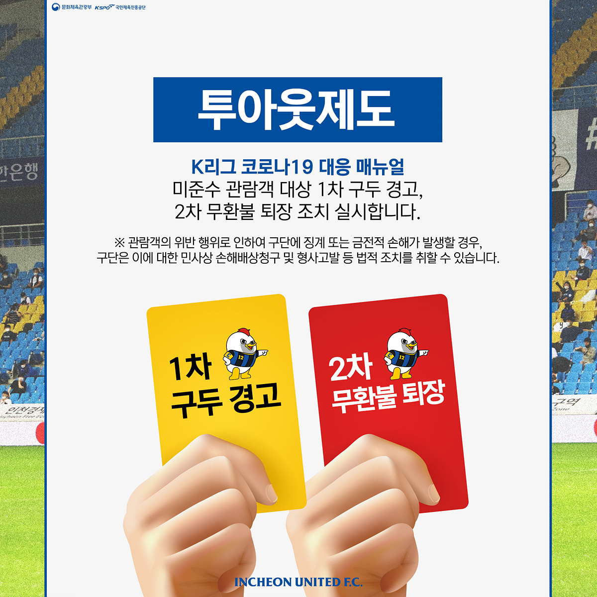 K리그 코로나19 대응 매뉴엘 미준수 관람객 대상 1차 구두경고, 2차 무환불 퇴장 조치를 실시합니다.