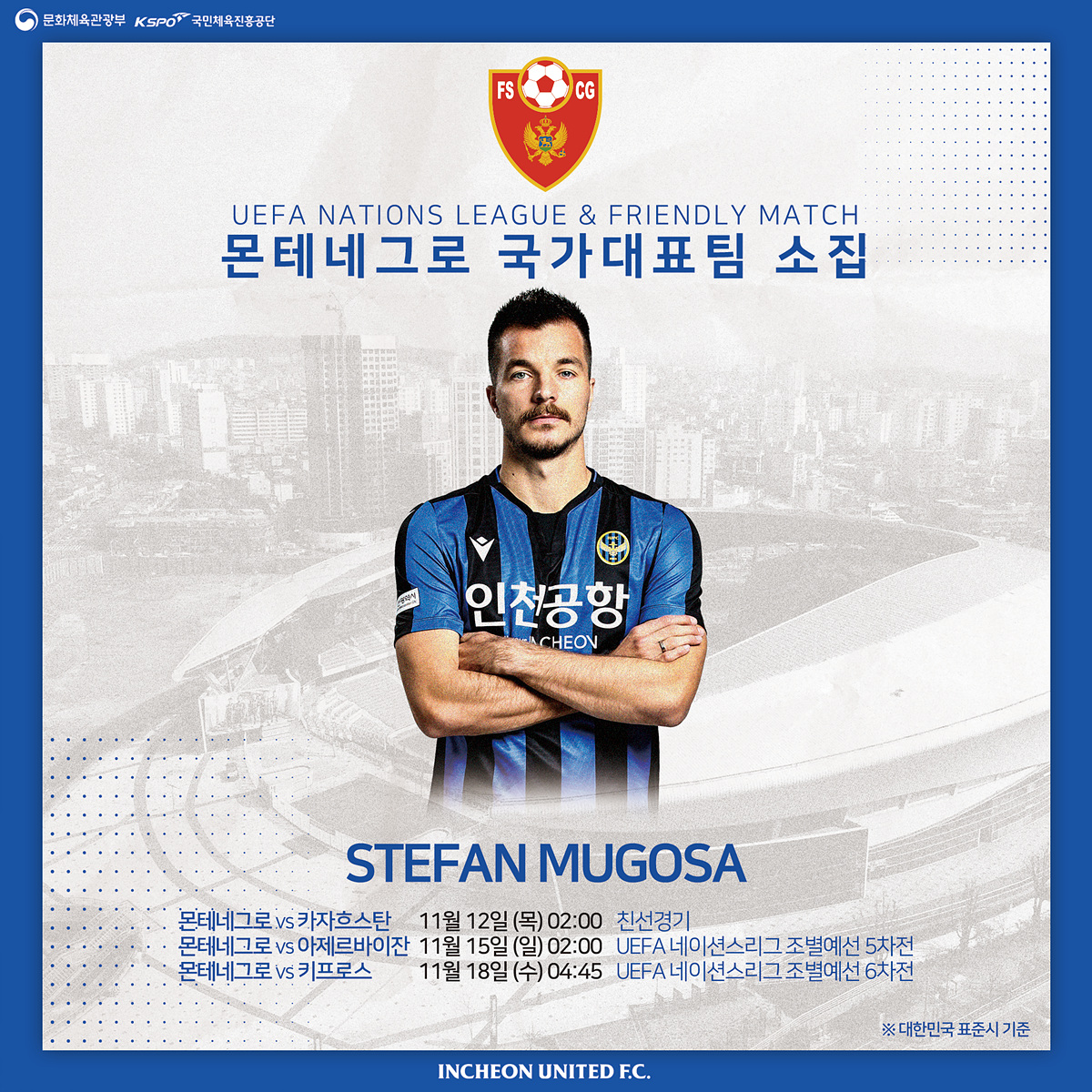 무고사 선수가 11월 'UEFA 네이션스리그 조별예선'에 참가하는 몬테네그로 국가대표팀에 차출되어 안내드립니다.