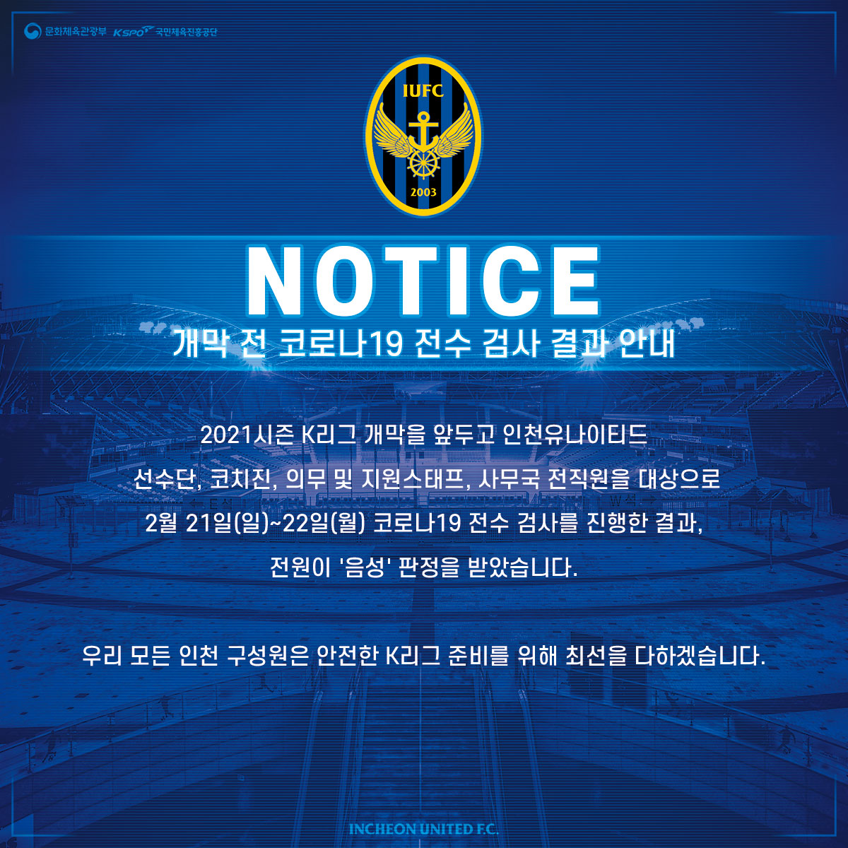2021시즌 K리그 개막을 앞두고 인천유나이티드 선수단, 코치진, 의무 및 지원스태프, 사무국 전직원을 대상으로 2월 21일(일)~22일(월) 코로나19 전수 검사를 진행한 결과, 전원이 '음성' 판정을 받았습니다.