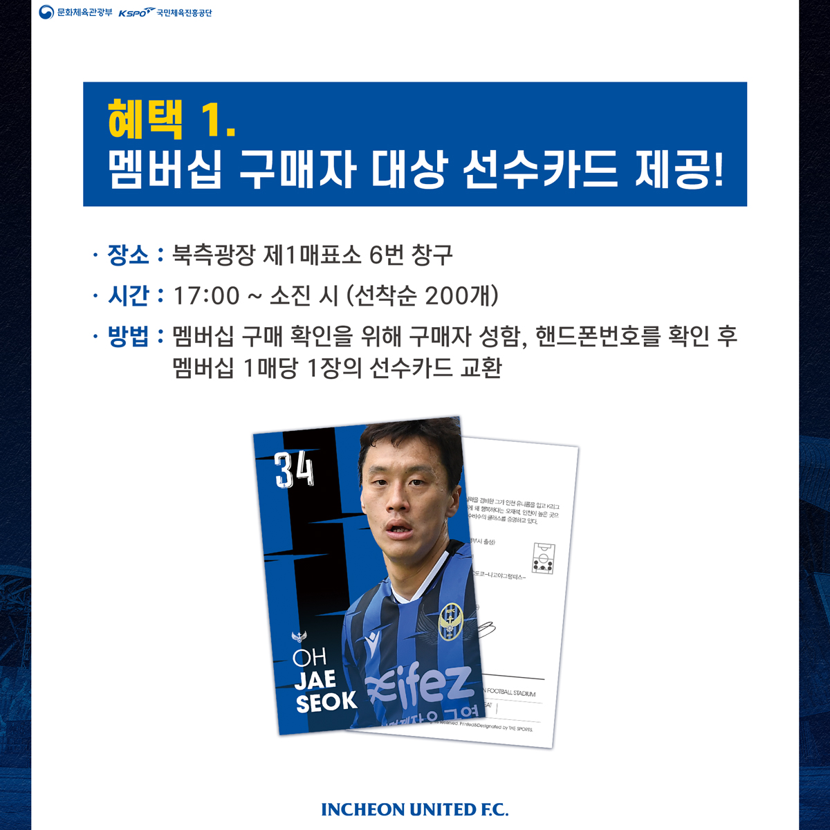 혜택 1. 멤버십 구매자 대상 오재석 선수카드 제공(선착순 200매)