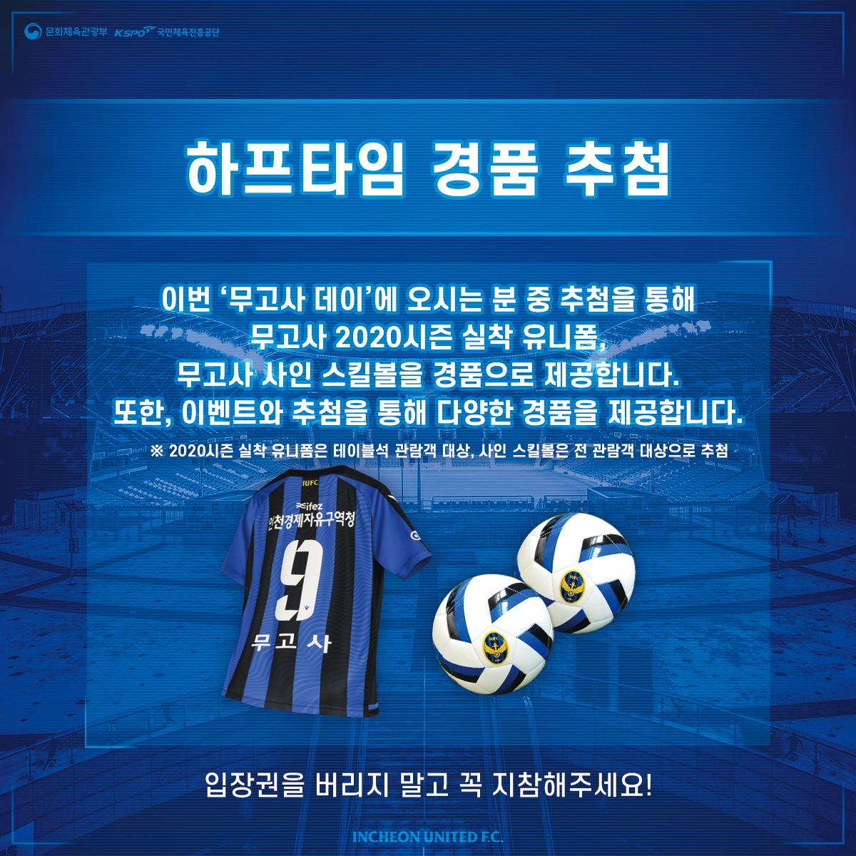 ‘무고사 데이’에 오시는 분 중 추첨을 통해 무고사 2020시즌 실착 유니폼, 무고사 사인 스킬볼을 경품으로 제공합니다. 또한, 이벤트와 추첨을 통해 다양한 경품을 제공합니다. 티켓을 버리지 말고 꼭 지참해주세요.