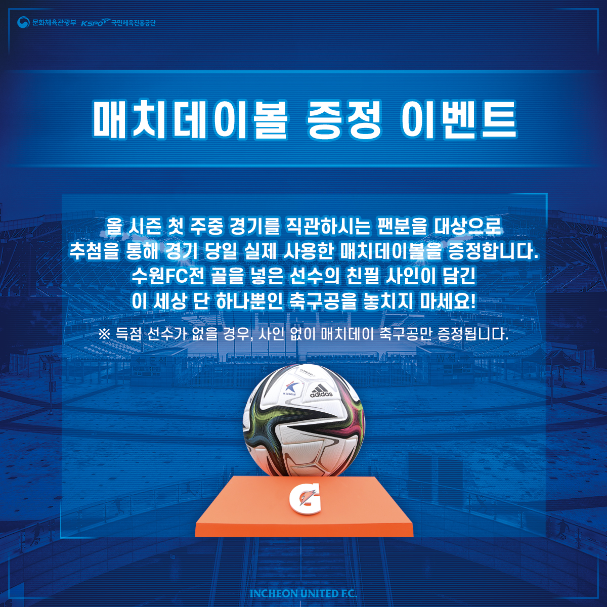 올 시즌 첫 주중 경기를 직관하시는 팬분을 대상으로 추첨을 통해 경기 당일 실제 사용한 매치데이볼을 증정합니다. 수원FC전 골을 넣은 선수의 친필 사인이 담긴 이 세상 단 하나뿐인 축구공을 놓치지 마세요!