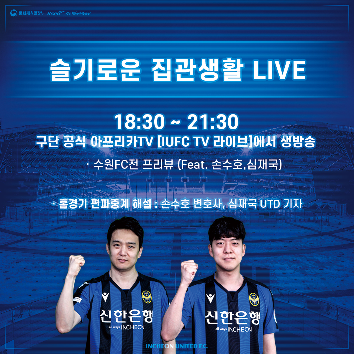 홈경기에 찾아온 팬이나 찾지 못한 팬 모두 참여할 수 있는 이벤트! 구단 아프리카TV 공식 계정 [IUFC TV 라이브]에서 경기 시작 1시간 전(18:30)부터 펼쳐지는 인천유나이티드 홈경기 편파중계를 '집관'하세요!
