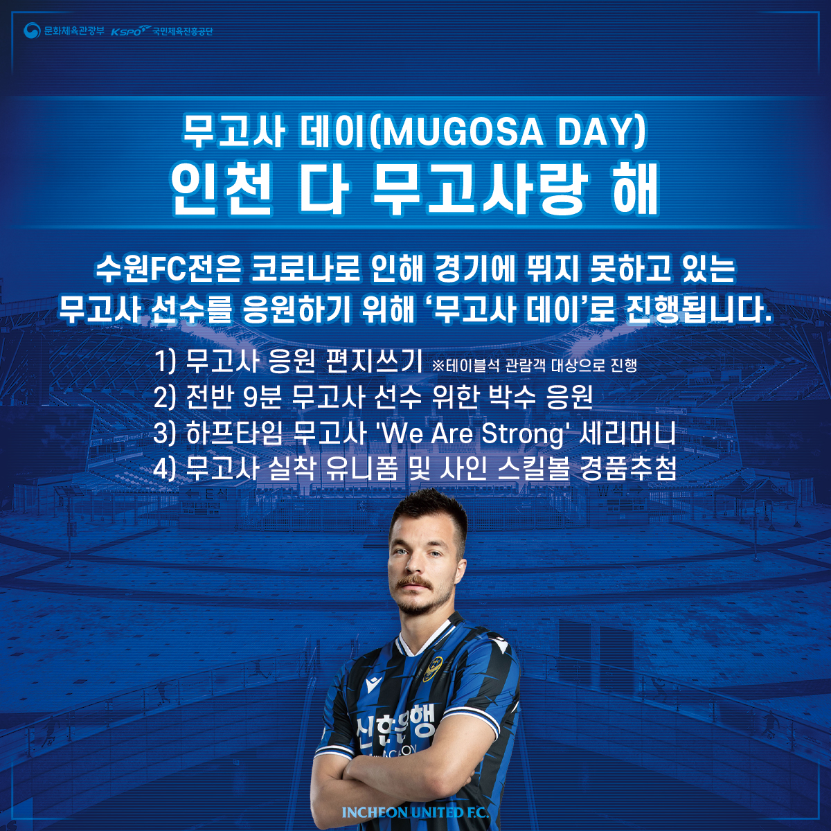 “인천, 다 무고사랑 해!” - 무고사 데이(Mugosa Day)3/17(수) 오후 7시 30분. 인천유나이티드가 수원FC를 상대로 2021시즌 K리그 1 5라운드 홈경기를 치릅니다. 이번 경기는 코로나19로 경기에 뛰지 못하고 있는 무고사 선수를 응원하기 위해 ‘무고사 데이(Mugosa Day)’로 진행됩니다.