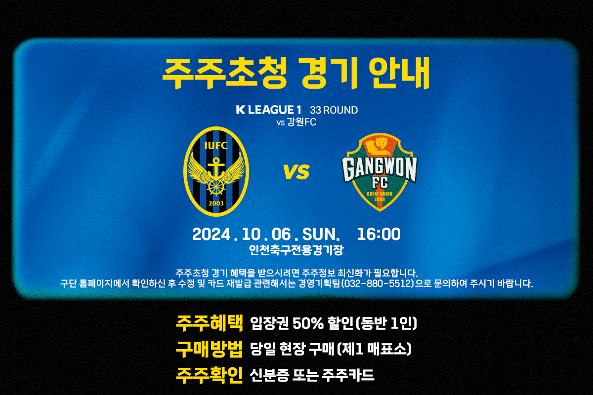 인천 구단은 오는 10월 6일 오후 3시 인천축구전용경기장에서 열리는 강원FC와의 ‘하나은행 K리그 1 2024’ 33라운드 홈경기를 ‘시민 주주의 날로’ 지정하여 시민 주주에게 입장권 할인, 경기장 내 CU 편의점 할인을 비롯해 다양한 이벤트를 진행한다고 9일 밝혔다.