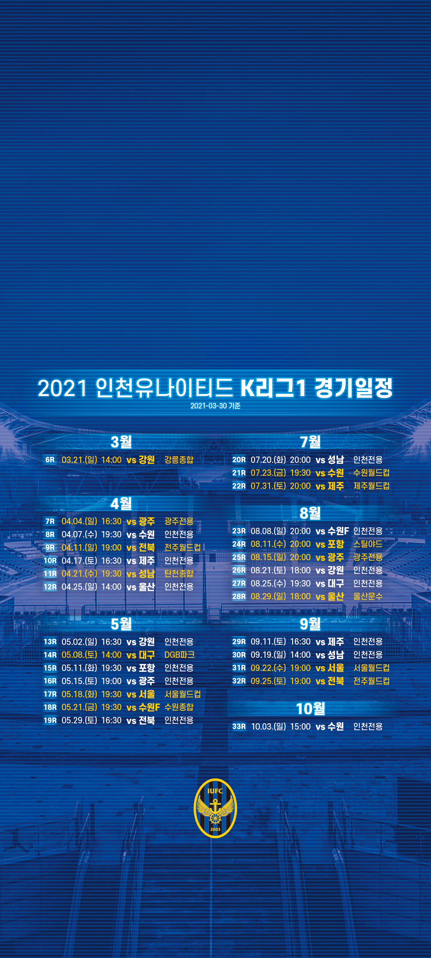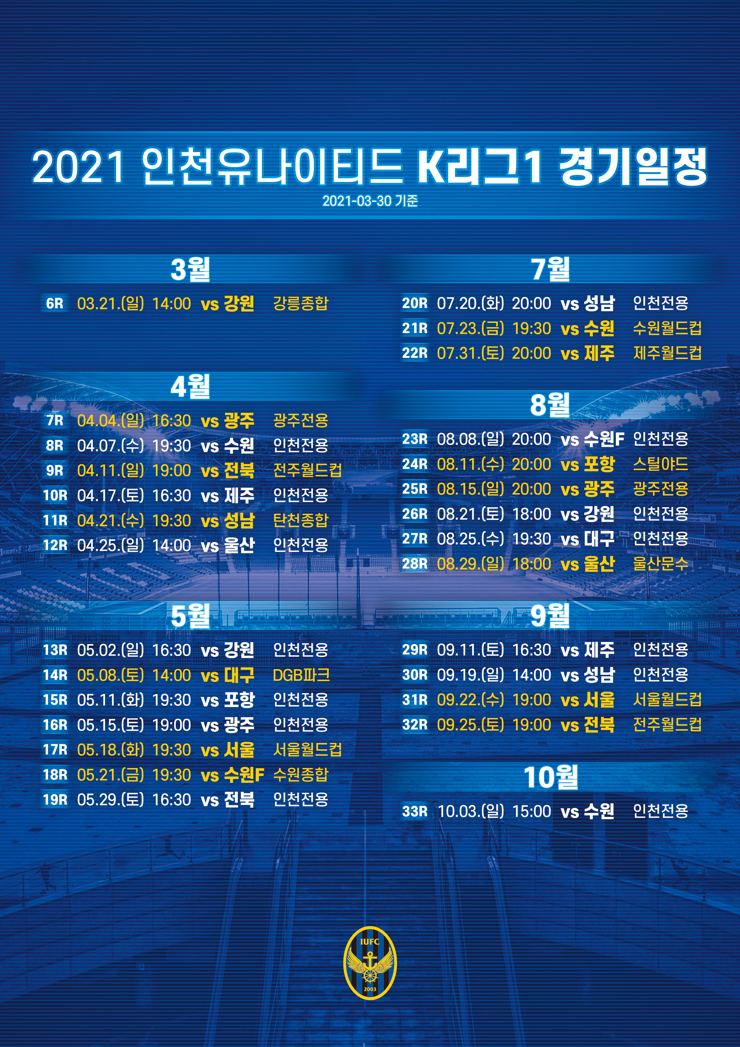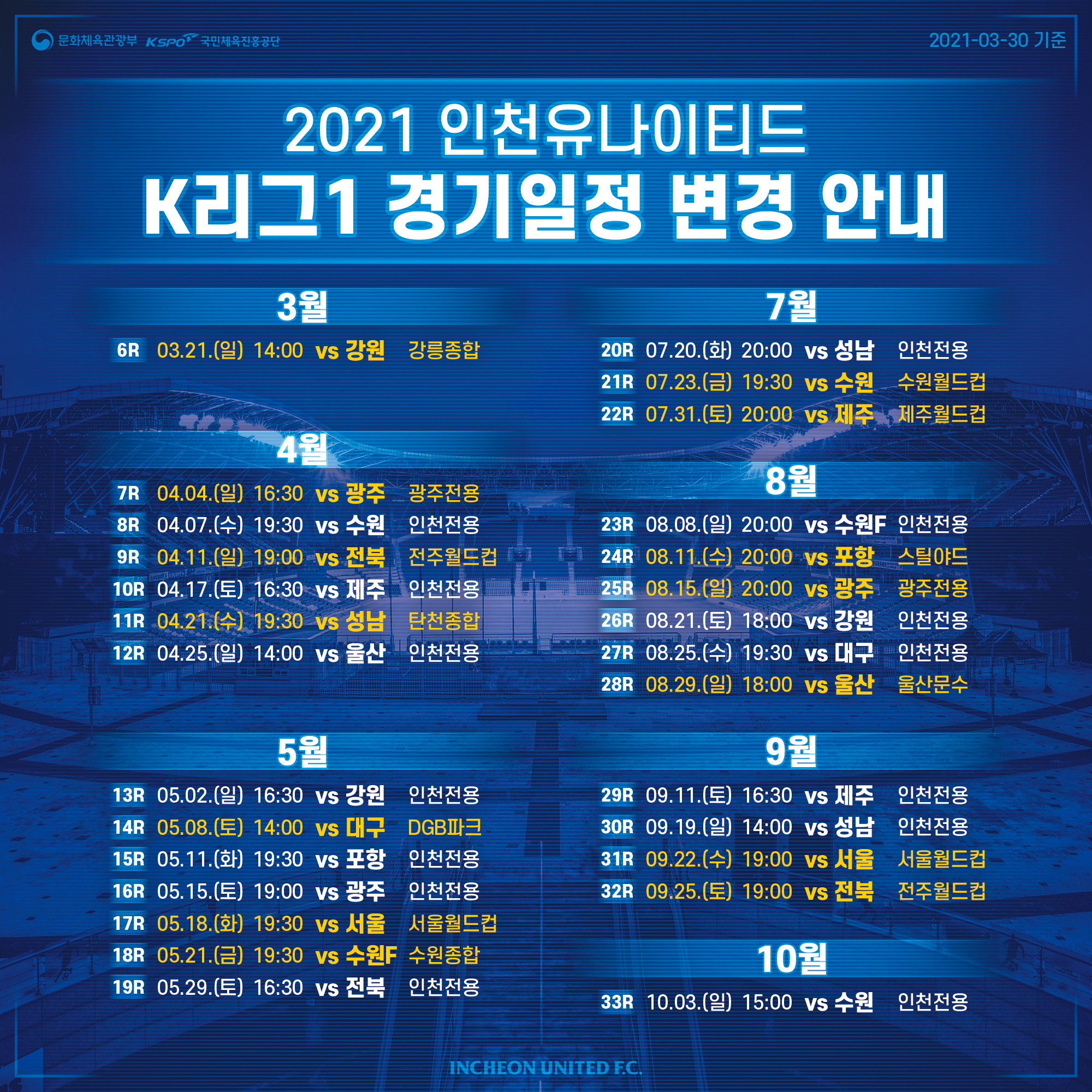 2021시즌 인천유나이티드 K리그 1 재변경된 경기일정 공개