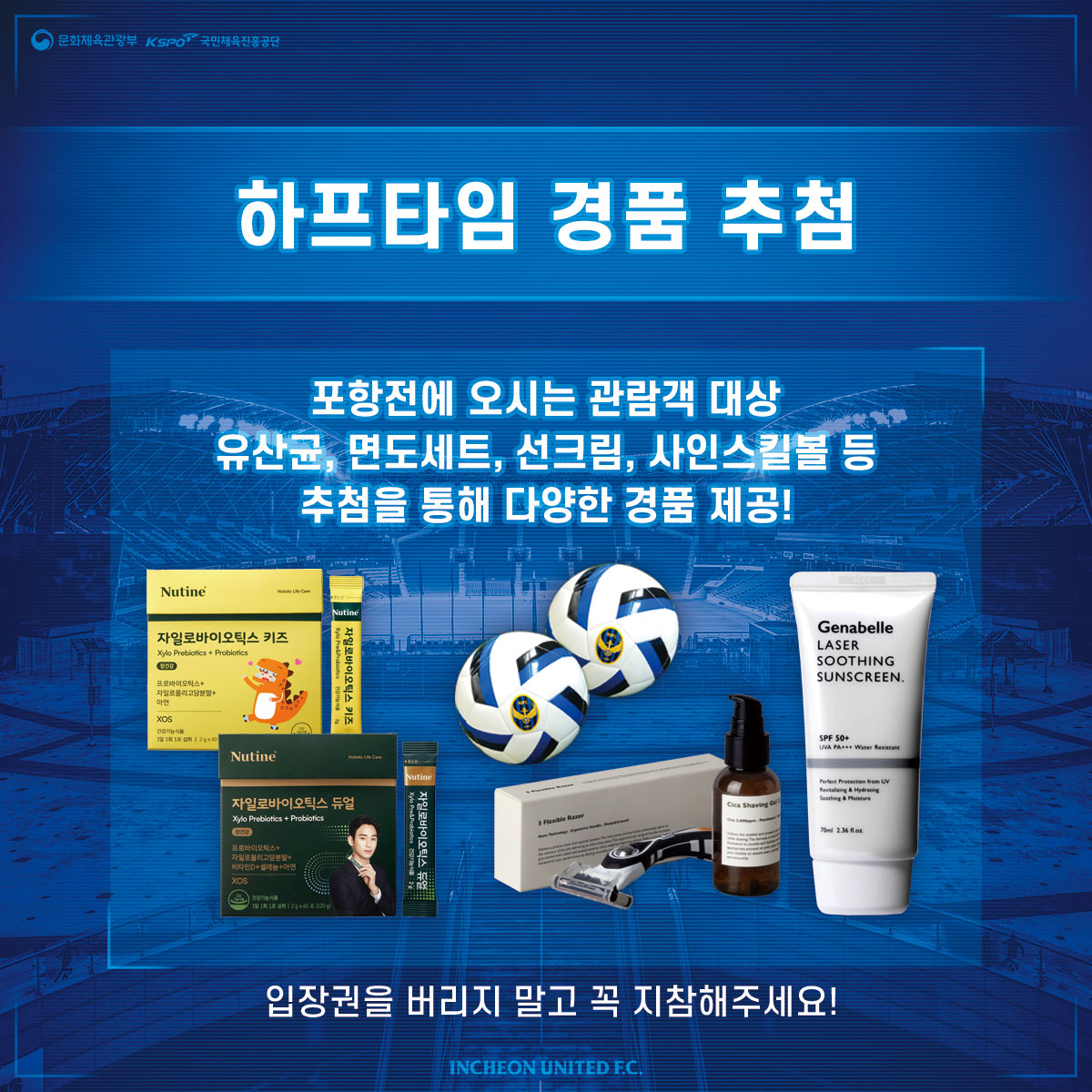 포항전에 오시는 관람객분을 대상으로 유산균, 면도세트, 선크림, 사인스킬볼 등 추첨을 통해 다양한 경품을 제공합니다. 티켓을 버리지 말고 꼭 지참해주세요.