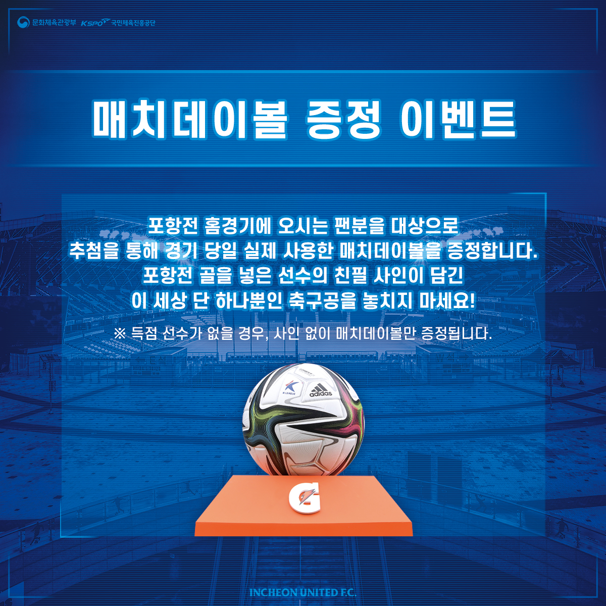 포항전 홈경기에 오시는 팬분을 대상으로 추첨을 통해 경기 당일 실제 사용한 매치데이볼을 증정합니다. 포항전 골을 넣은 선수의 친필 사인이 담긴 이 세상 단 하나뿐인 축구공을 놓치지 마세요!