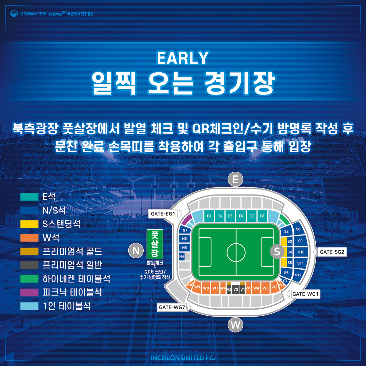 이번 홈경기에 오시는 모든 관람객분은 1)먼저 북측광장 풋살장에서 발열 체크 및 QR코드/수기 방명록을 작성하고, 2)문진 완료 손목띠를 착용 후 각 출입구를 통해 입장하셔야 합니다.