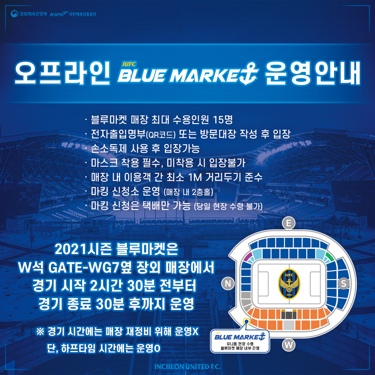 이번 홈경기 당일 오프라인 블루마켓 매장이 정상 운영됩니다. 2021시즌 블루마켓(W석 GATE-WG7옆)은 경기 시작 2시간 30분 전부터 운영됩니다. 아래 블루마켓 운영 시간을 참고하셔서 안전하고 즐거운 쇼핑 되시길 바랍니다.