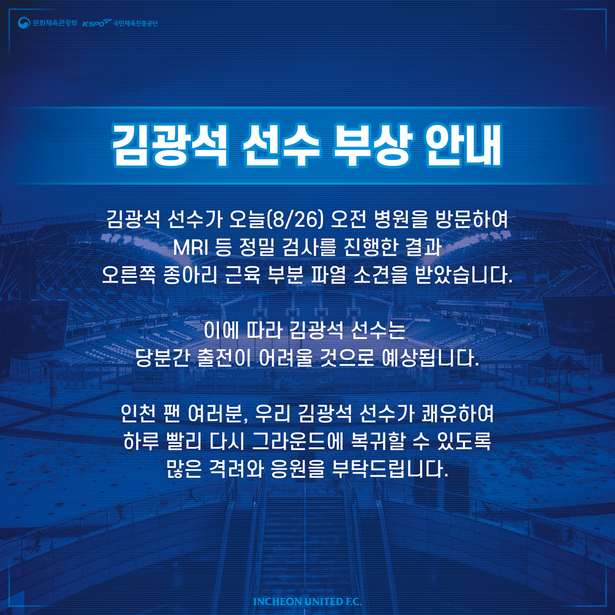 인천 팬 여러분, 우리 김광석 선수가 쾌유하여 하루 빨리 다시 그라운드에 복귀할 수 있도록 많은 격려와 응원을 부탁드립니다. 감사합니다.INCHEON UNITEDMEDIA FEEDS