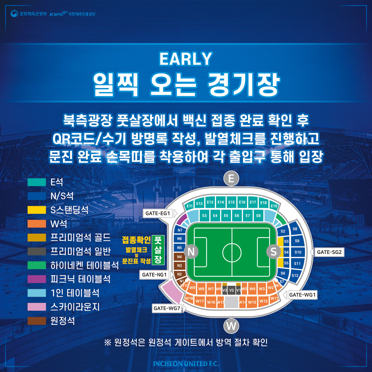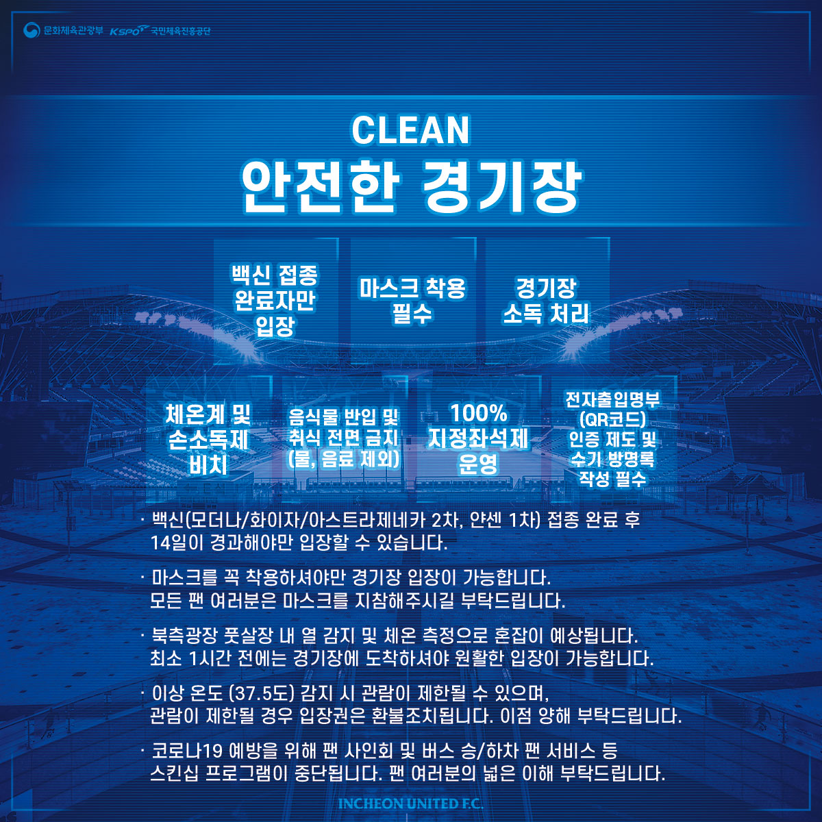 이번 홈경기에 오시는 모든 관람객분은 1)먼저 북측광장 풋살장에서 백신 접종완료 확인 및 QR코드/수기 방명록을 작성하고, 2)발열 체크 후 3)문진 완료 손목띠를 착용 후 각 출입구를 통해 입장하셔야 합니다.