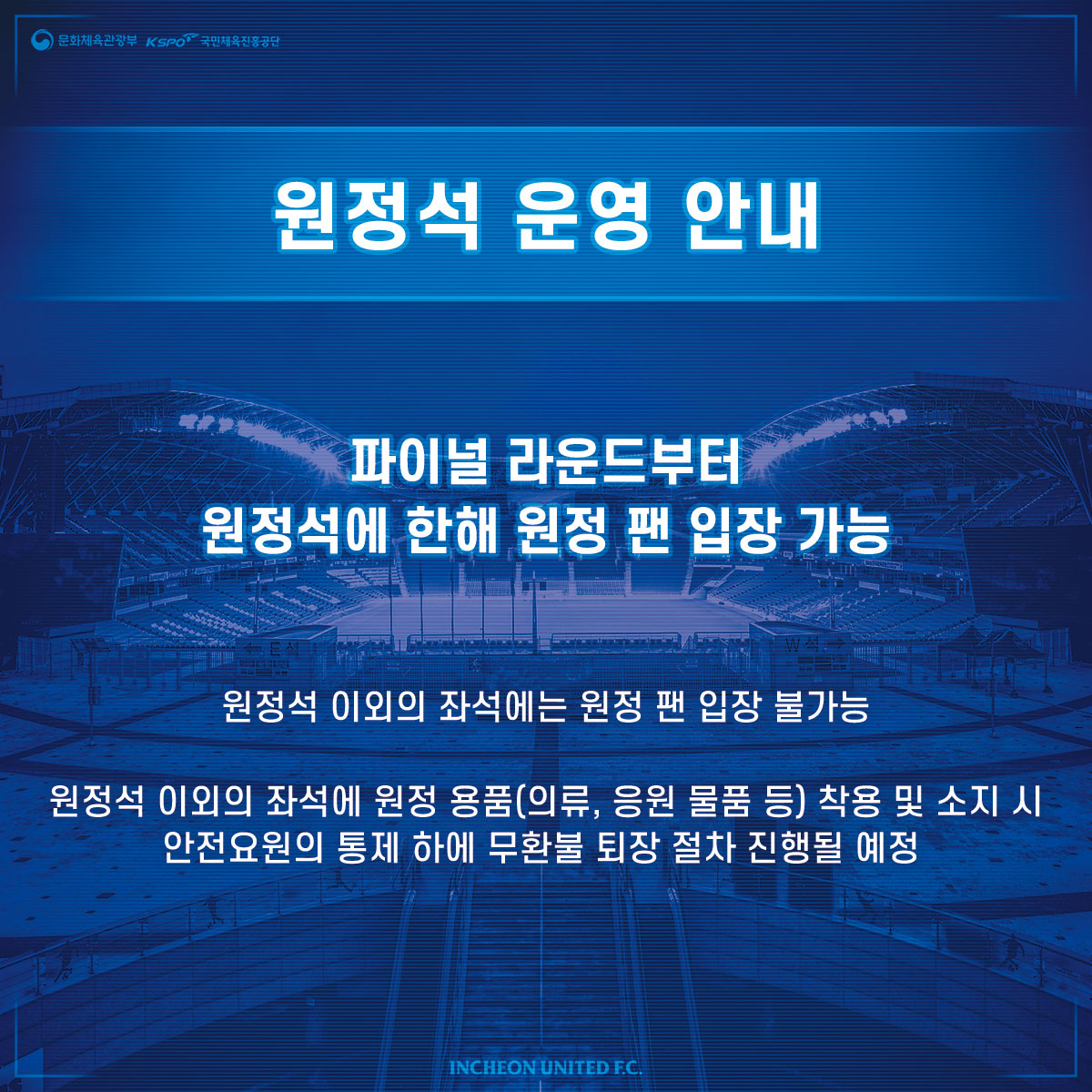 이번 파이널 라운드부터 원정석에 한해 원정 팬의 입장이 가능합니다. 다만 원정석 이외의 좌석에는 원정 팬 입장이 불가능합니다.