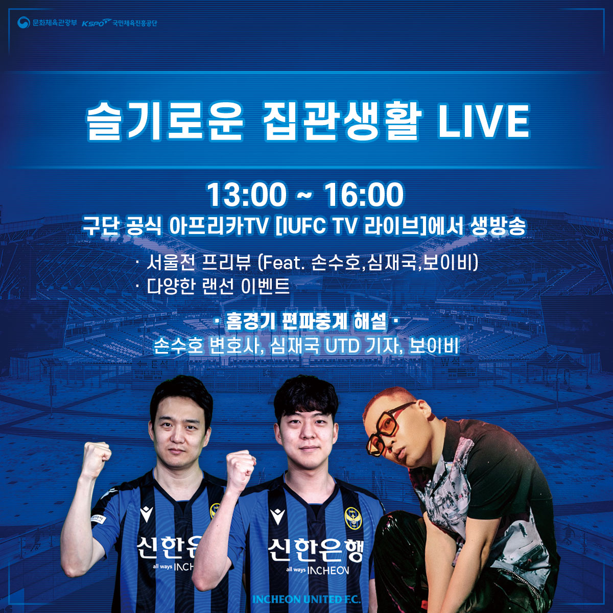 홈경기에 찾아온 팬이나 찾지 못한 팬 모두 참여할 수 있는 이벤트! 구단 아프리카TV 공식 계정 [IUFC TV 라이브]에서 경기 시작 1시간 전(13:00)부터 펼쳐지는 인천유나이티드 홈경기 편파중계를 '집관'하세요!