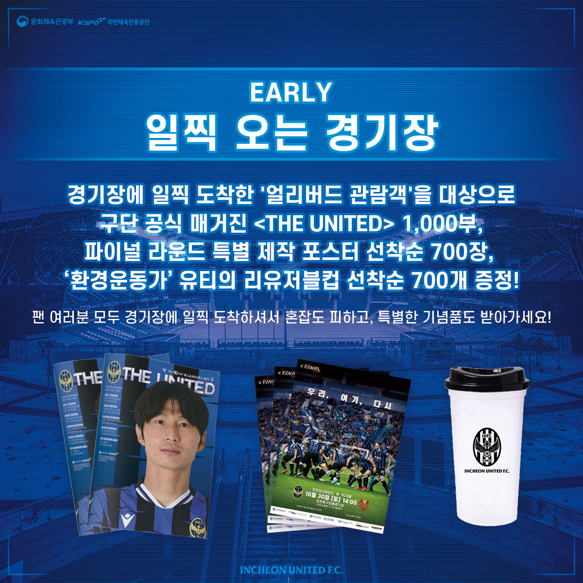 북측광장 풋살장에서 구단 공식 매거진 THE UNITED를 선착순 1,000부 증정하며 구단 통산 700경기를 기념하여 북측광장 풋살장에서 파이널 라운드 특별 제작 포스터를 선착순 700장, 북측광장 인포메이션 부스에서 ‘환경운동가’ 유티의 리유저블컵 선착순 700개를 증정합니다.