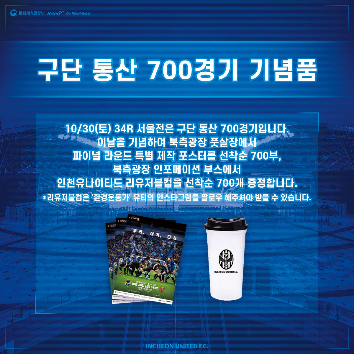 팬 여러분, 인천유나이티드의 통산 700경기 승리도 응원하고 유티가 준비한 특별 포스터와 리유저블컵도 받아가세요!