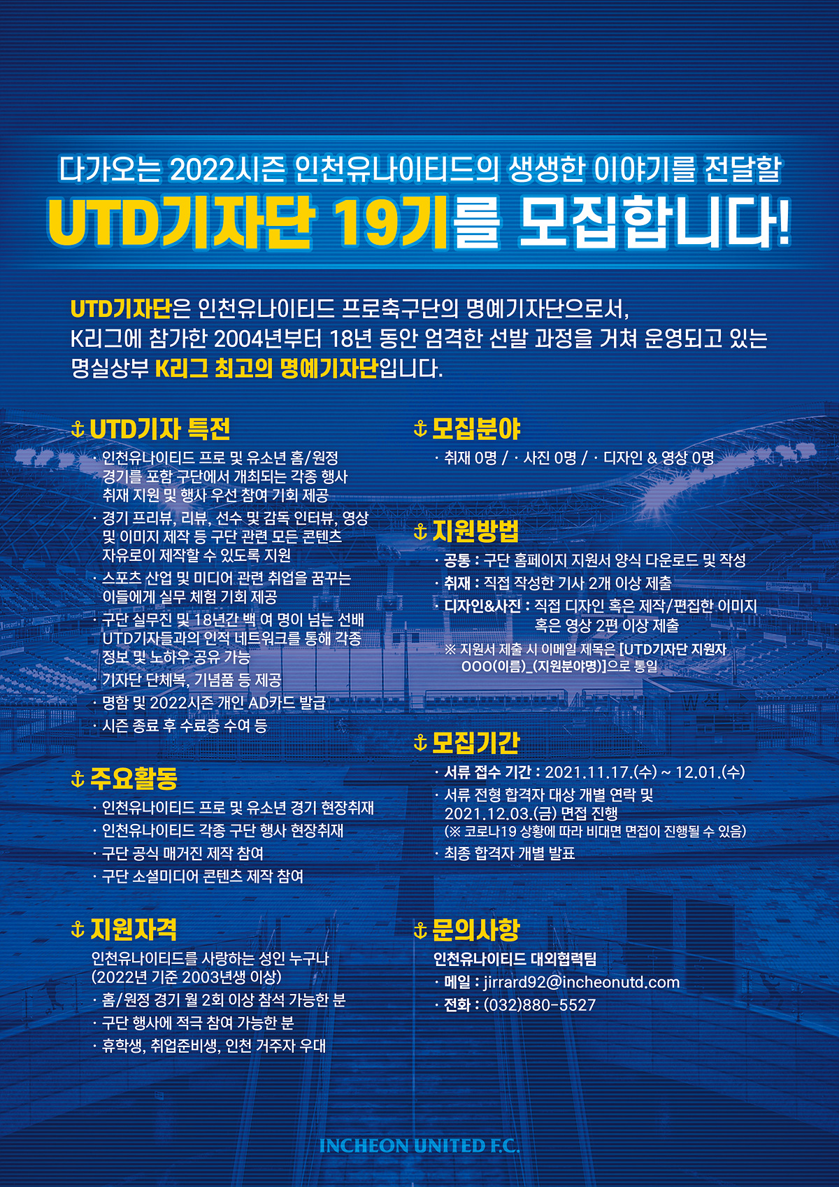 인천유나이티드 프로축구단과 다가오는 2022시즌을 함께 할 UTD기자단 19기를 모집합니다.