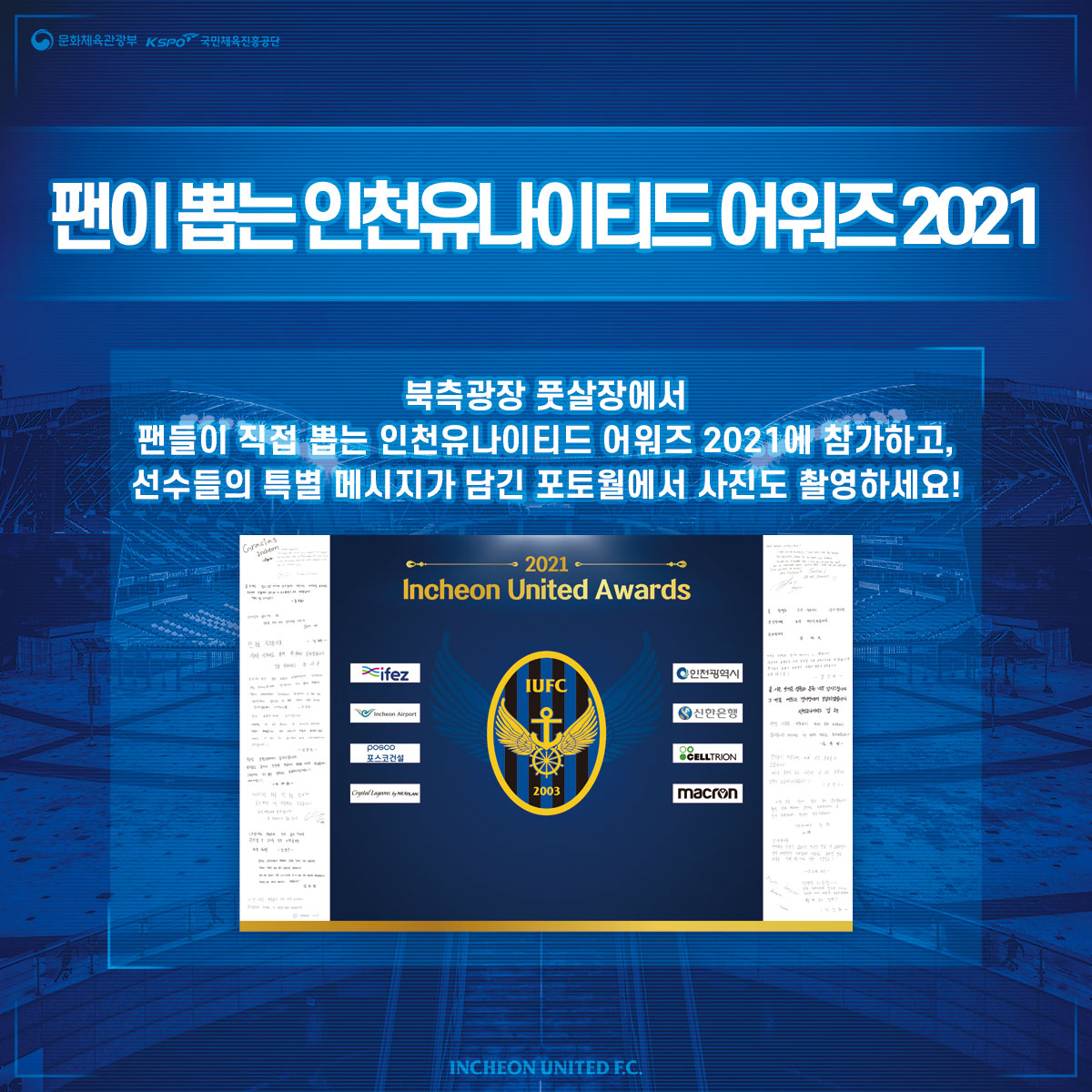 북측광장 풋살장 내에 선수들의 특별 메시지가 담긴 포토월과 함께 2021 인천유나이티드 어워즈 투표가 진행됩니다. 팬들이 뽑는 2021 인천유나이티드 어워즈에 많은 팬 여러분의 참여 부탁드립니다.