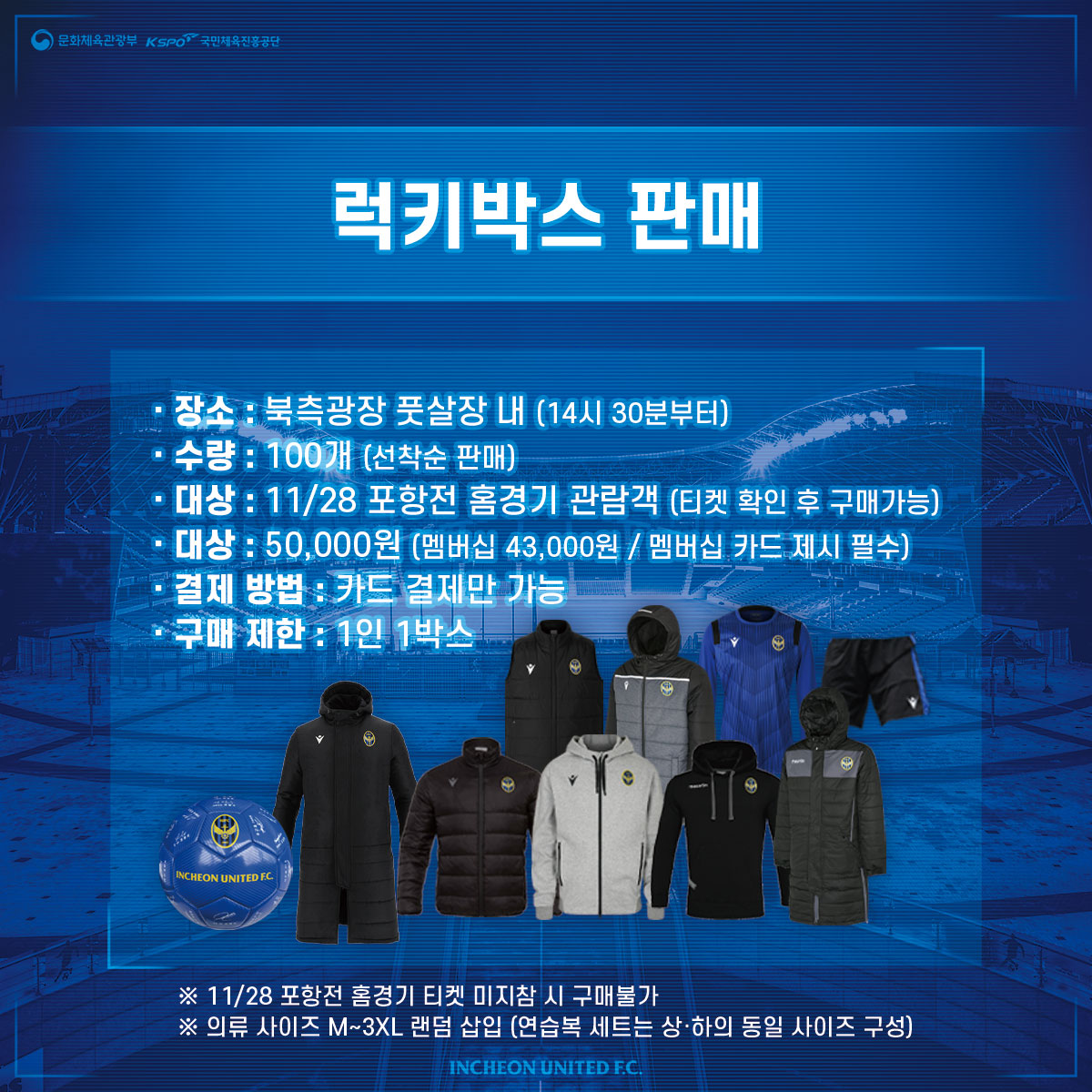 이번 포항전에는 북측광장에서 럭키박스 선착순 100개를 판매합니다. 2021시즌 동계 의류, 2020시즌 임시유니폼(선수 마킹 포함), 인천유나이티드 고급 다이어리(몰스킨), 친필 사인 스킬볼 등 다양한 MD상품이 준비되어 있습니다.