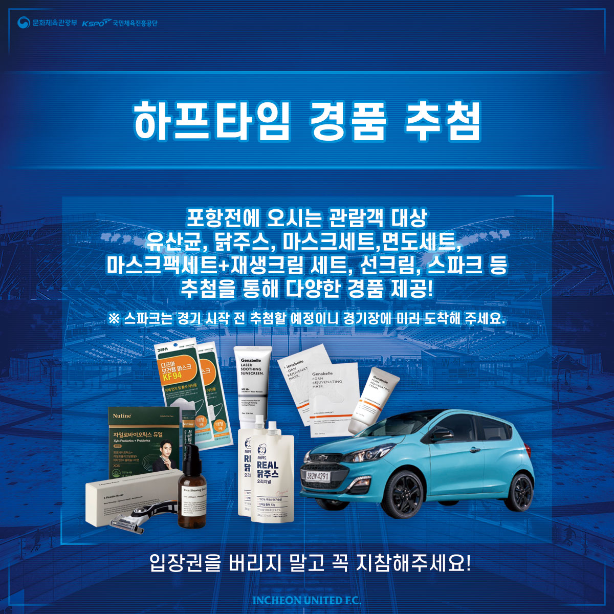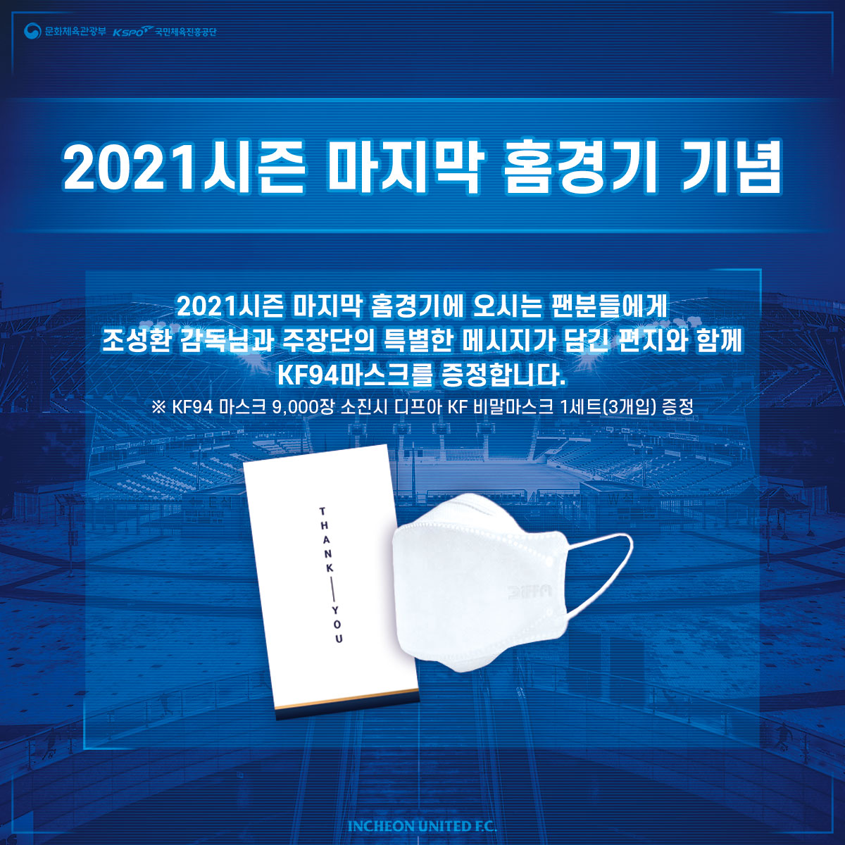 2021시즌 마지막 홈경기를 기념하여 포항전에 오시는 관람객분을 대상으로 유산균, 닭주스, 마스크 세트, 면도세트, 마스크팩+재생크림 세트, 선크림, 스파크 등 추첨을 통해 경품을 제공합니다. 2021년 인천유나이티드에 아낌없는 응원을 보내주신 팬 분들을 위해 다양하고 많은 경품을 준비했으니, 티켓을 버리지 말고 꼭 지참해 주세요.