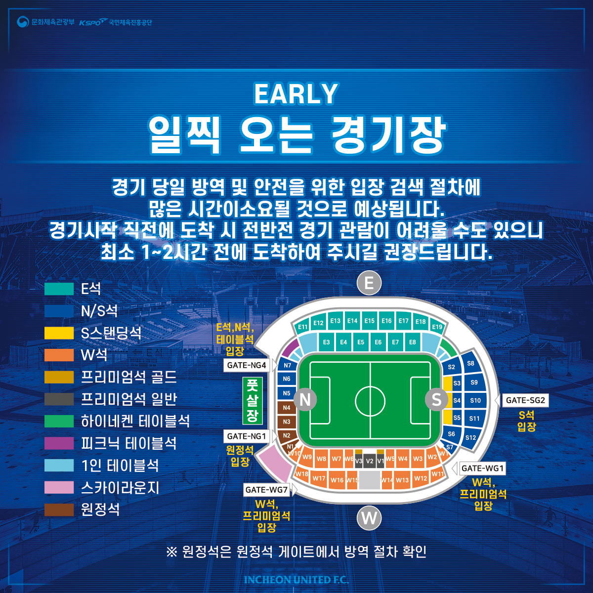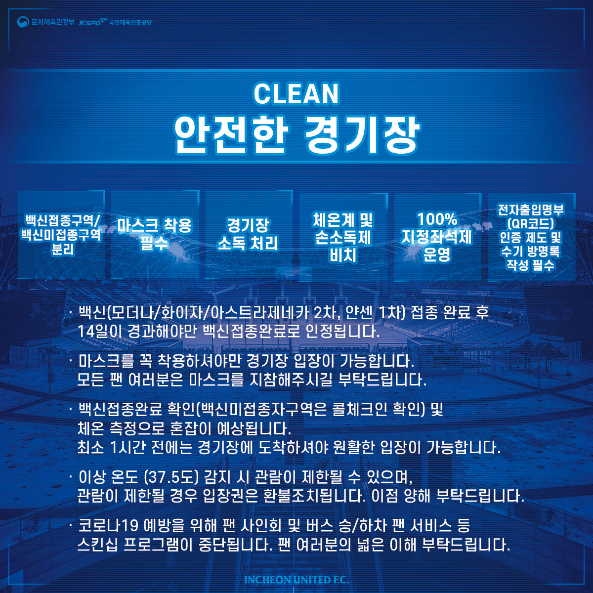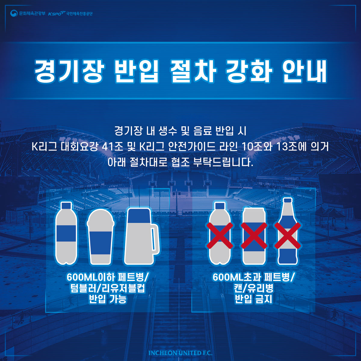 안전한 인천축구전용경기장을 만들기 위해 인천유나이티드와 관람객 여러분의 협조가 필요합니다. 아래 사항을 참고 및 숙지 부탁드립니다.