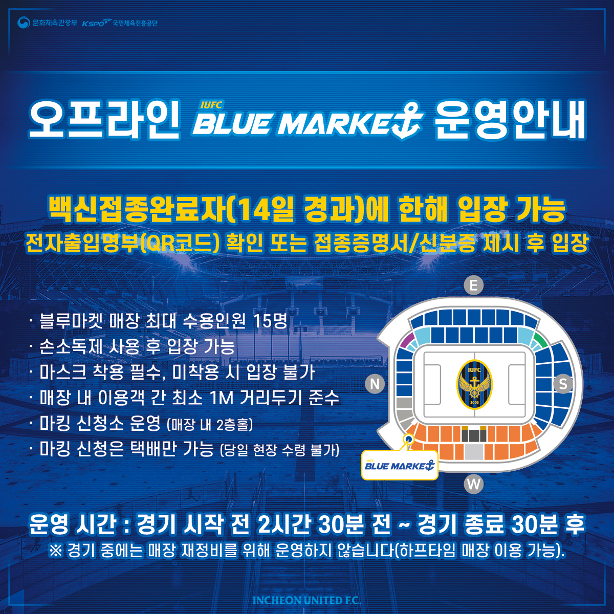 이번 홈경기 당일 오프라인 블루마켓 매장이 정상 운영됩니다. 2021시즌 블루마켓(W석 GATE-WG7옆)은 경기 시작 2시간 30분 전부터 운영됩니다. 아래 블루마켓 운영 시간을 참고하셔서 안전하고 즐거운 쇼핑 되시길 바랍니다.