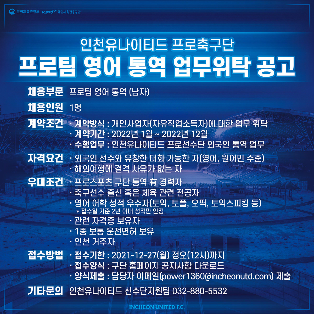인천유나이티드 프로축구단과 다가오는 2022시즌을 함께할영어 통역을 공고합니다.