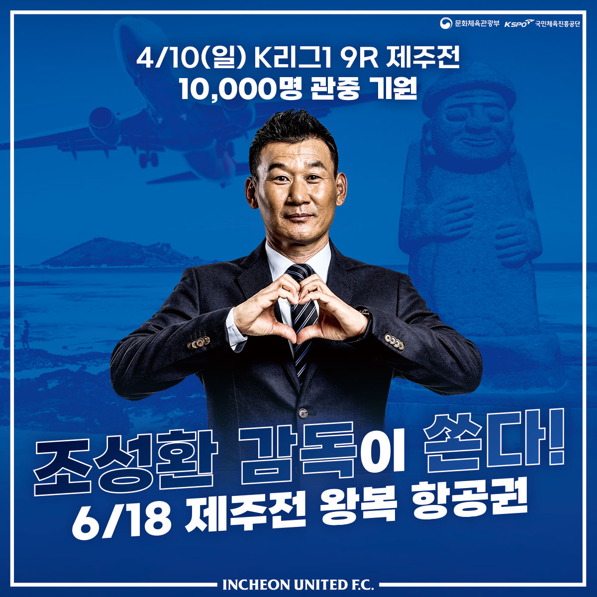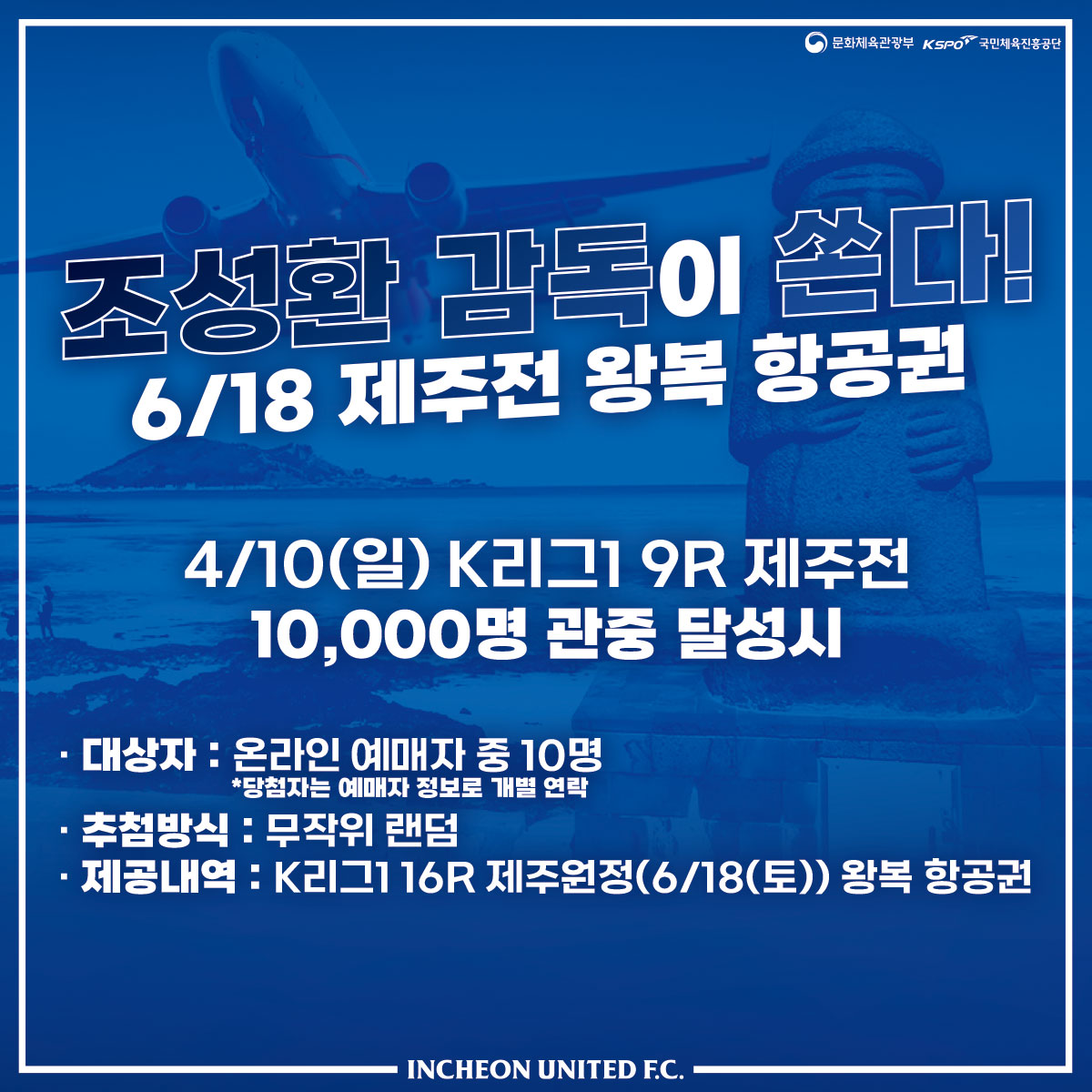 ※당첨자는 경기 종료 후 온라인 예매 데이터를 토대로 공정하게 추첨 될 예정조성환 감독의 4/10(일) 제주전 홈경기 직관 팬 대상 제주 원정 항공권 제공 공약 안내