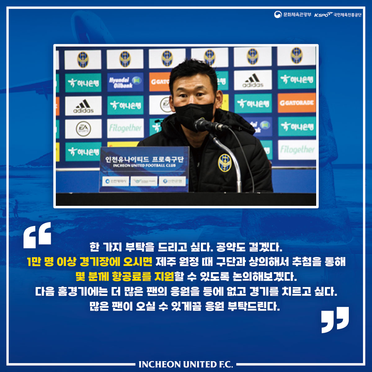 이번 제주전 홈경기에 1만 명 이상 팬들이 찾아주시어 선수단에 힘을 실어주시면