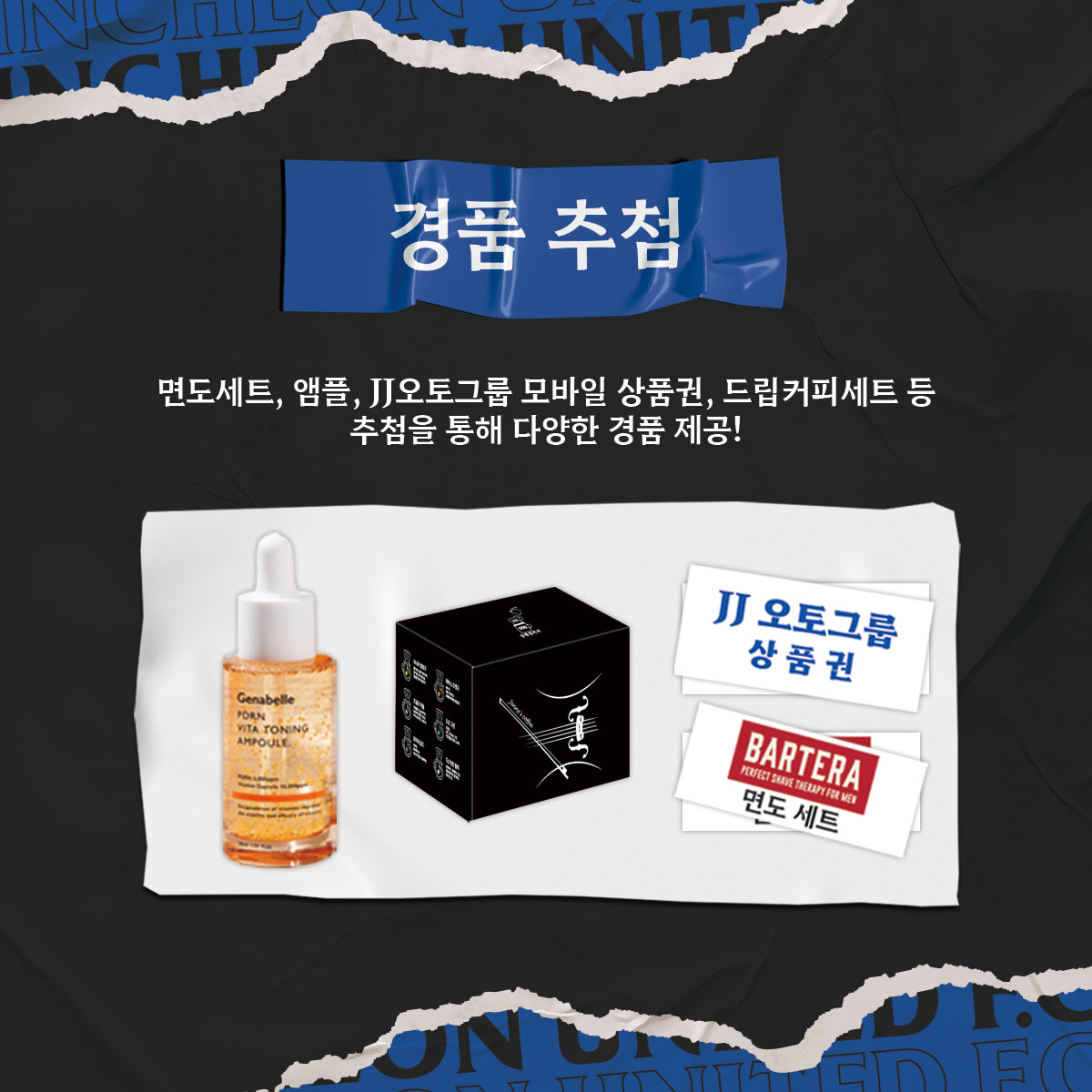 전북전에 오시는 관람객분을 대상으로 면도세트, 앰플, JJ 오토그룹 모바일 상품권, 드립커피 세트 등 추첨을 통해 제공합니다. 티켓을 버리지 말고 꼭 지참해 주세요!