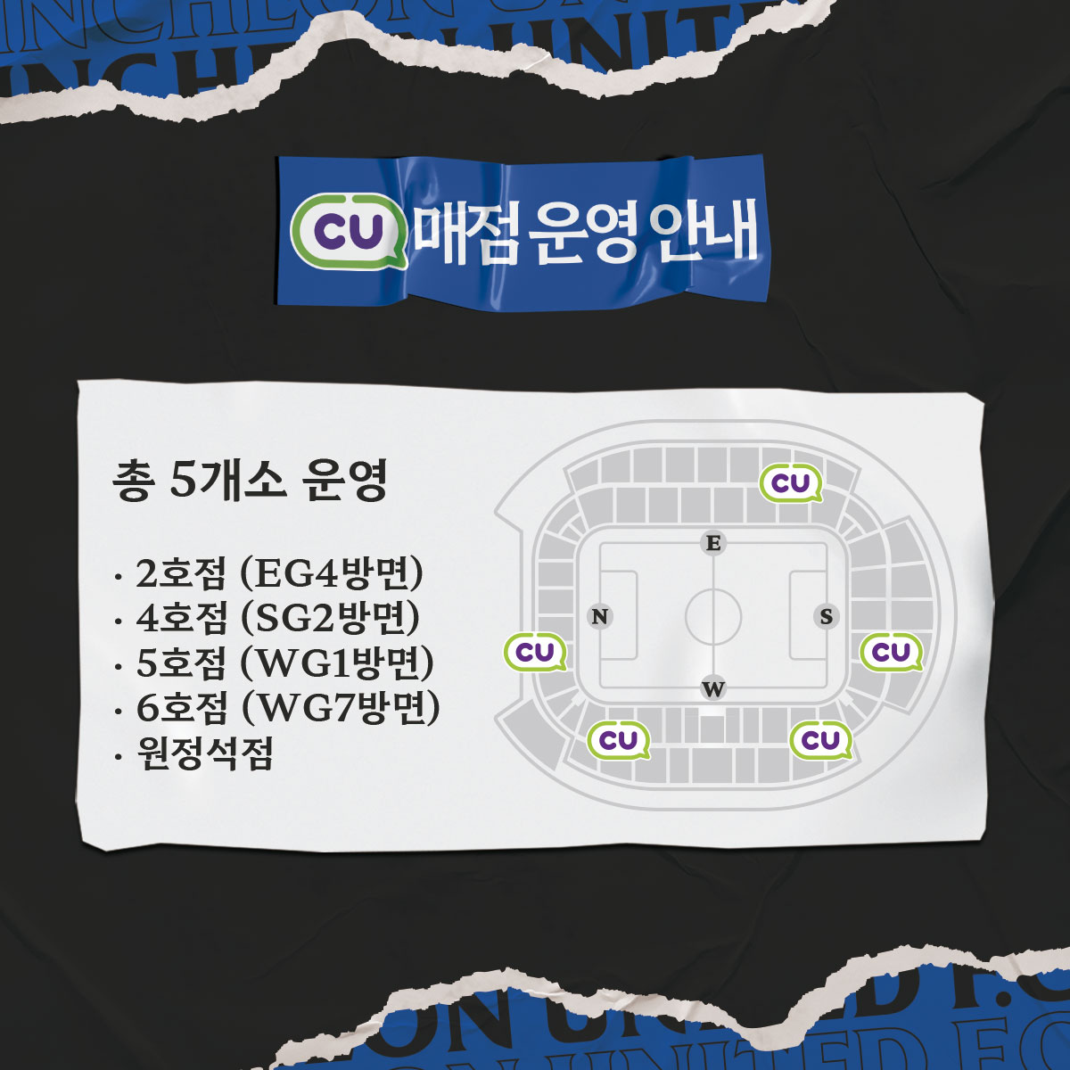 경기장 내 CU 편의점은 5곳을 운영합니다. 자세한 사항은 이미지를 참고해주세요.