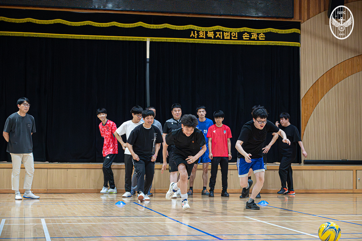 [UTD기자단=인천] 인천유나이티드가 재능기부 활동을 통해 상생의 가치를 일깨웠다.인천유나이티드가 지난 18일 오후 6시 30분 인천예림학교에서 진행된 발달장애인 축구교실에 참석하여 재능기부 수업을 진행했다. 수업에 참여한 이들은 사회복지법인 손과손 핸인핸부평에 소속된 발달장애인 축구단으로, 18일을 시작으로 수업을 계속 진행할 예정이며 아카데미 미추홀지부 오세일 지부장의 지도로 진행되었다.총 14명이 참여한 이번 수업은 화기애애한 분위기 속에서 진행됐다. 오세일 지부장은 다양한 프로그램을 체계적으로 준비했고, 적극적으로 진행하며 참가자들과 소통했다. 첫 단계로는 스텝 운동을 진행했는데, 참가자들은 이 과정을 통해 자연스럽게 컨디션을 끌어올렸다. 오세일 지부장은 격려와 박수를 보내면서 참가자들이 더욱 자신감을 가질 수 있도록 하였다.스텝 운동을 마친 후에는 본격적으로 공을 다루는 활동이 진행되었다. 오 지부장은 드리블, 턴, 터치 등 다양한 기술을 선보이면서 이목을 사로잡았다. 동시에, 해당 기술을 어렵지 않고 자연스럽게 습득할 수 있도록 친절한 설명을 덧붙였다. 참가자들은 처음에 어려움을 겪기도 했지만, 수업을 따라오면서 차츰 발전하는 모습을 보여줬다. 적극적인 태도와 큰 목소리로 열정을 보이는 모습도 인상적이었다.즐거운 분위기가 가득한 가운데 어느덧 첫 수업의 끝이 다가왔다. 참가자들은 만족감을 표시하며 다음 수업도 기대된다는 반응을 보였다. 수업이 종료된 후, 오세일 지부장은 “생각보다 참가자들이 잘 따라와서 가르치는 데 큰 부담이 없었다. 열심히 하는 모습이 보기 좋았고, 나도 기분이 좋다”는 소감을 남겼다.화기애애한 분위기를 조성하기 위해 어떤 점에 집중했는지 묻자, 오 지부장은 “목소리를 크게 하고, 분위기를 나부터 끌어올려야 배우는 사람도 즐겁게 따라온다. 그래서 나부터 힘을 내고, 적극적으로 이끌자는 다짐을 했다”고 밝혔다. 참가자들에 대해서는 “무언가를 특별히 얻는 것보다도, 이 자리에 와서 즐거운 마음을 가졌으면 좋겠다. 축구에도 많은 관심을 보여주면 더욱 좋을 것 같다”면서 행복한 분위기를 유지하길 바란다는 소망을 전했다.인천은 이번 수업을 기획하고 진행하면서 지역과의 소통을 강화하고자 하였다. 다양한 사회공헌활동을 전개하고 있는 인천은 앞으로도 지역사회에 이바지하고, 인천 시민과 끊임없이 소통하는 구단으로 거듭나기 위해 노력할 예정이다.[인천예림학교]글 = 이지우 UTD기자 (jw2000804@naver.com)사진 = 이다솜 UTD기자저작권자 – 인천UTD기자단. 무단 전재 및 재배포 금지.