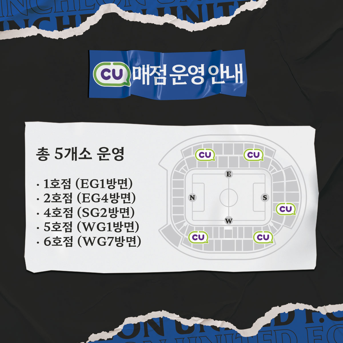 경기장 내 CU 편의점은 5곳을 운영합니다. 자세한 사항은 이미지를 참고해주세요.