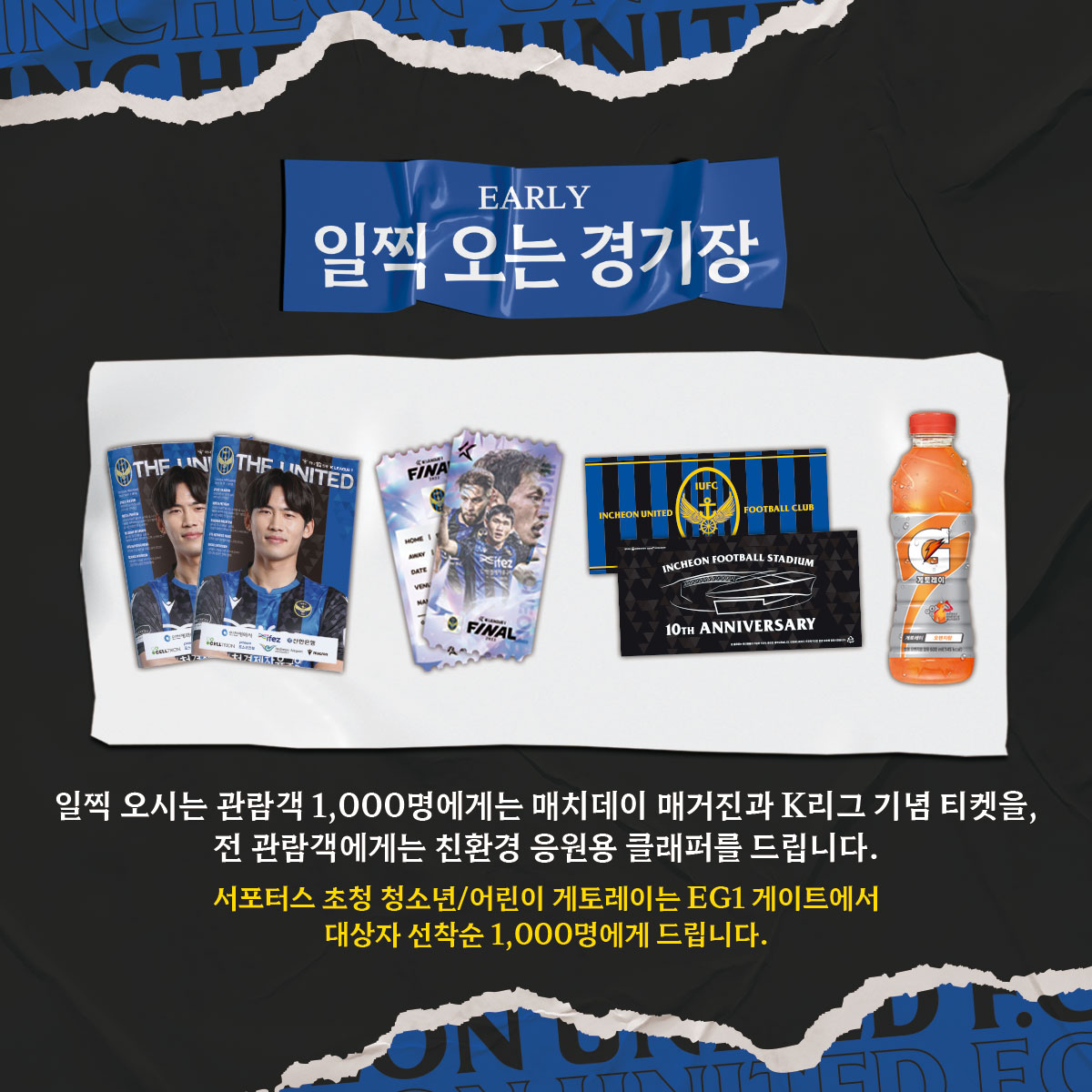 서포터스 파랑검정 초청 청소년·어린이 관람객 선착순 1,000명에게는 EG1 게이트에서 게토레이 음료수를 드립니다!