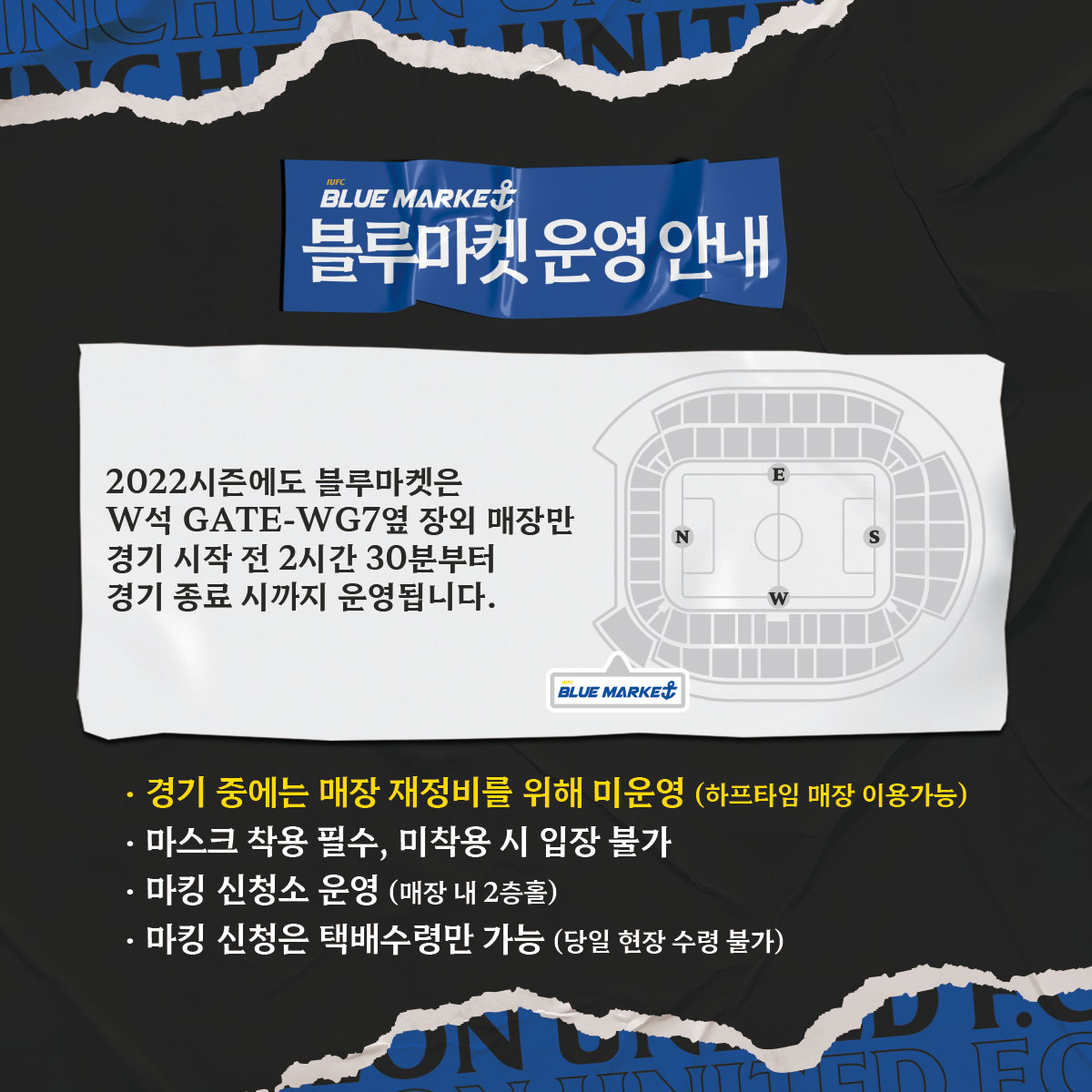 이번 홈경기 당일 오프라인 블루마켓 매장이 정상 운영됩니다. 2022시즌 블루마켓(W석 GATE-WG7옆)은 경기 시작 2시간 30분 전부터 운영됩니다. 아래 블루마켓 운영 시간을 참고하셔서 안전하고 즐거운 쇼핑 되시길 바랍니다.