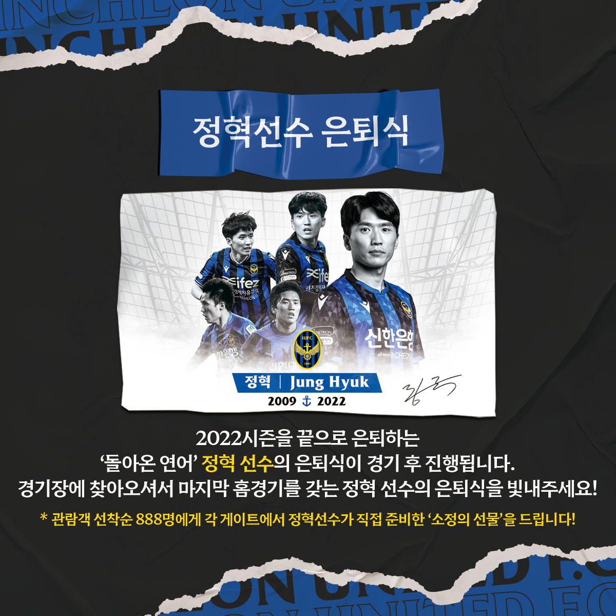 2009년 인천에서 데뷔해 2022년 인천에서 선수생활을 마치는 정혁 선수의 은퇴식이 경기 종료 후 S석 앞 그라운드에서 진행됩니다.