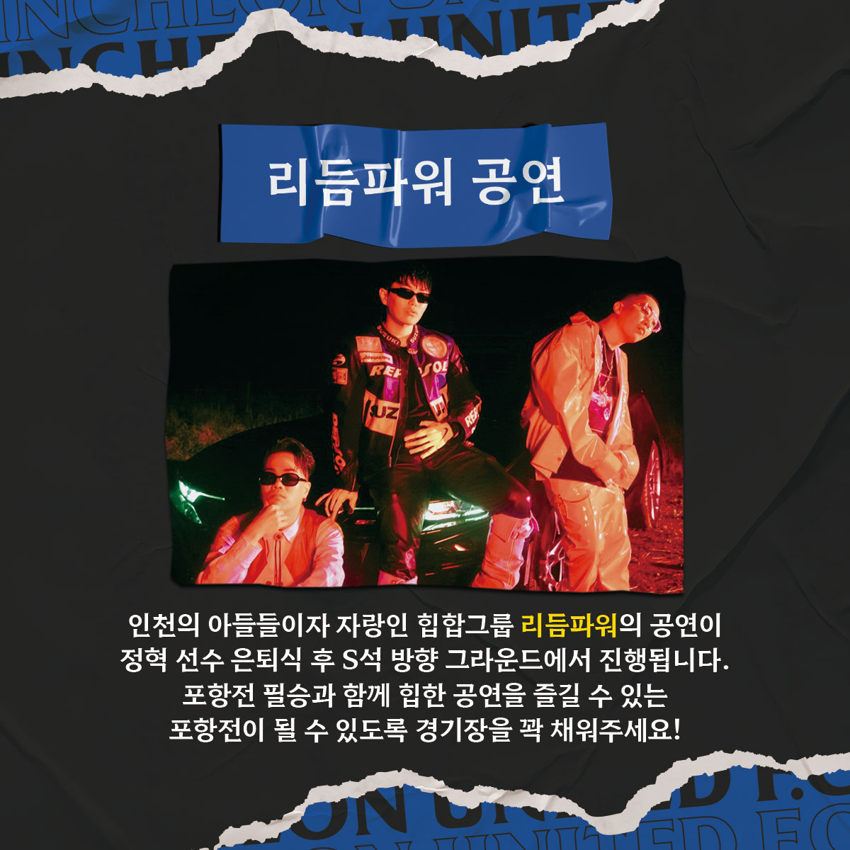 인천의 아들이자 자랑인 힙합그룹 리듬파워의 공연이 정혁 선수의 은퇴식 후 S석 앞 그라운드에서 진행됩니다.